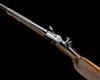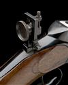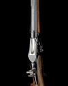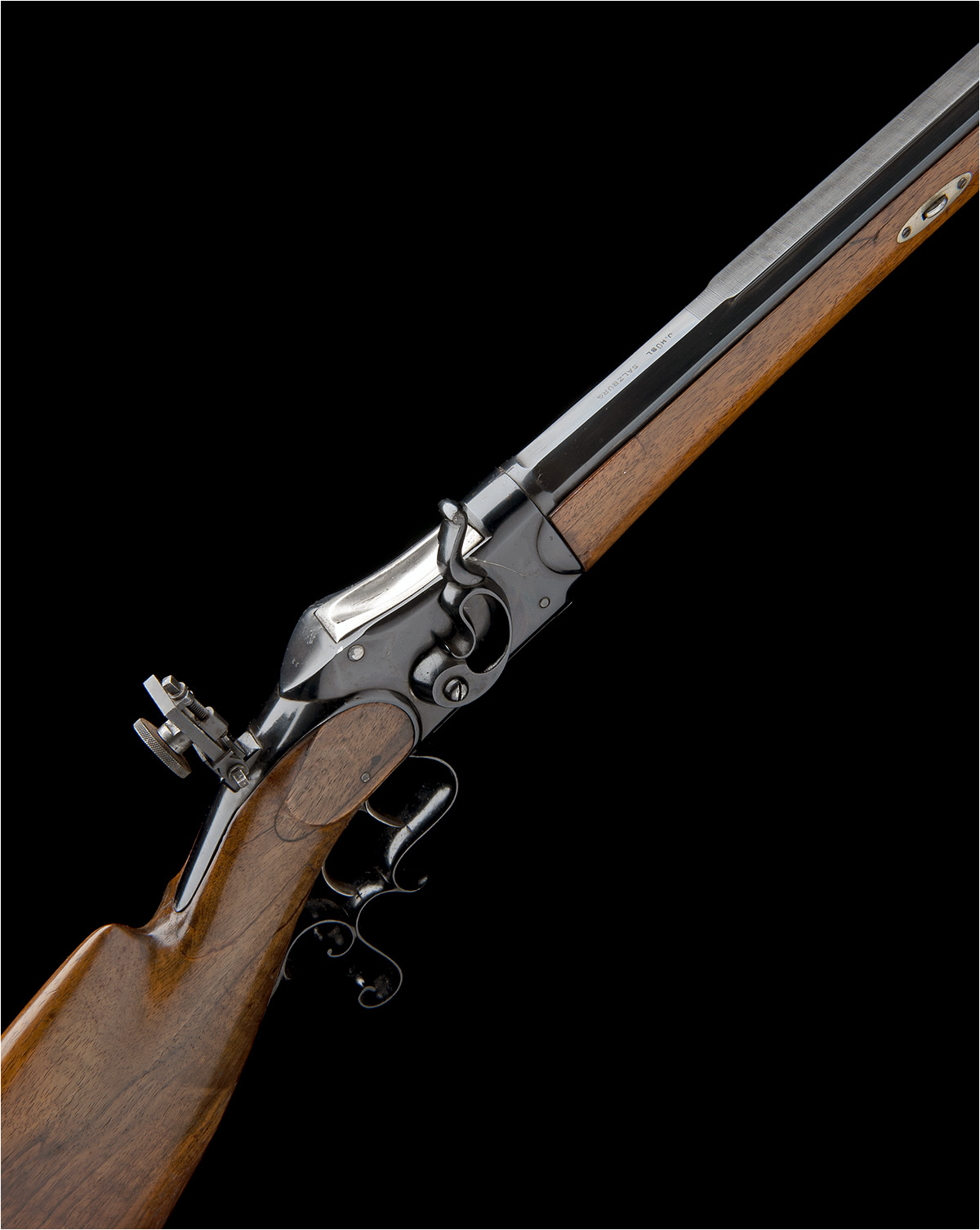 circa 1920 and retailed by 'T. LAUGHER, LORRACH' with 29 3/8in. blued octagonal barrel with protected fore-sight, matted integral rail to the top flat and signed near breech 'J. HUBL, SALZBURG', plain slab-sided receiver signed by the retailer, large carved cocking lever mounted to the right hand side, adjustable tang-mounted peep-sight, scrolled underlever triggerguard with finger spur, double-set triggers, walnut butt-stock with raised moulded cheek-piece (cracked through, pinned and repaired at hand), Swiss-style iron heel-plate and smooth walnut schnabel fore-end, refinished throughout