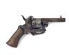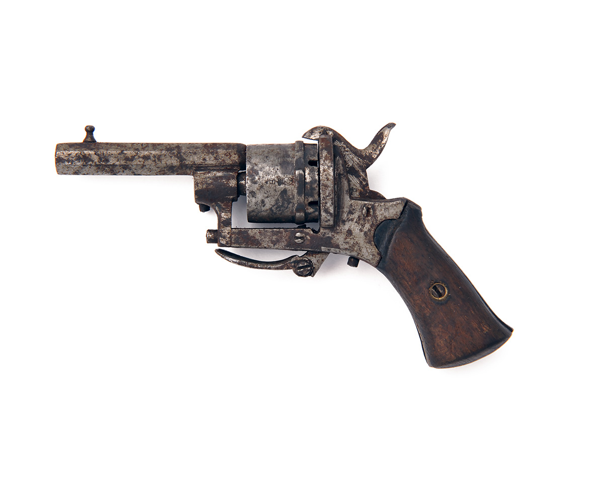 A 6mm PINFIRE POCKET-REVOLVER, UNSIGNED, no visible serial number, Belgian circa 1870, with octagonal 2in. barrel, plain cylinder, open iron frame and flared smooth wood grips, action at fault, missing ejector