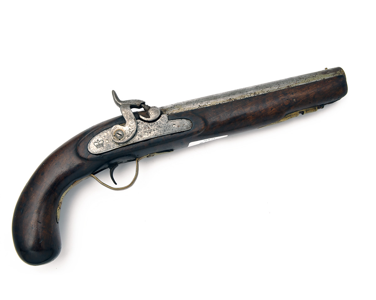 A 10-BORE PERCUSSION HORSE-PISTOL SIGNED TOWER, no visible serial number, probably repurposed from a musket for colonial use, with round iron 9 1/2in. barrel, borderline engraved lock of flint form and walnut full-stock with bg-shaped grip