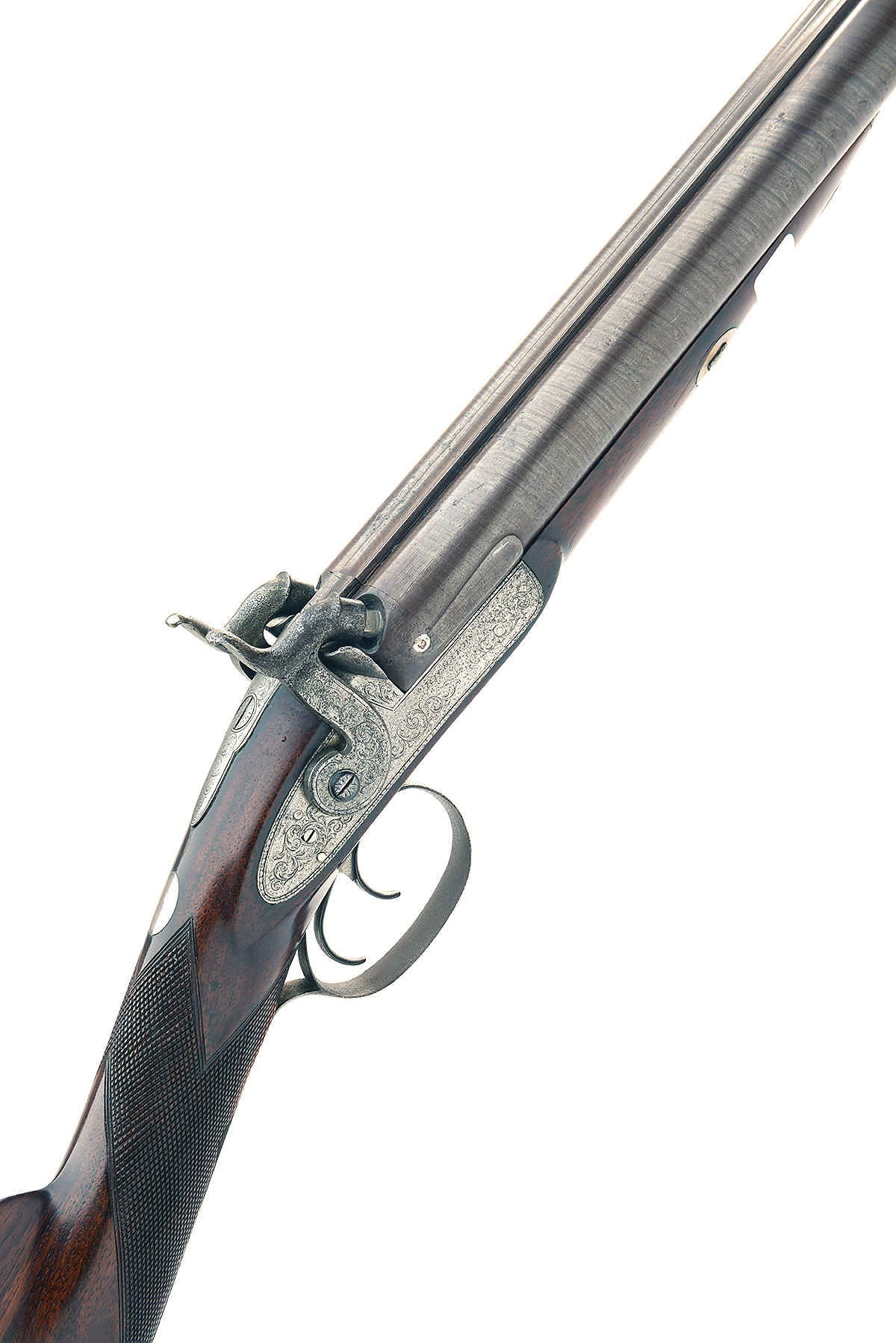 A 9-BORE PERCUSSION DOUBLE-BARRELLED DUCK-GUN SIGNED RICHARDS, no visible serial number, circa 1850, with 26in. twist barrels (apparent original length), borderline and scroll engraved bar-action signed locks (detail rubbed) and walnut half-stock chequered at the wrist with iron furniture and original brass-tipped ramrod (one thimble loose but present)