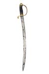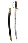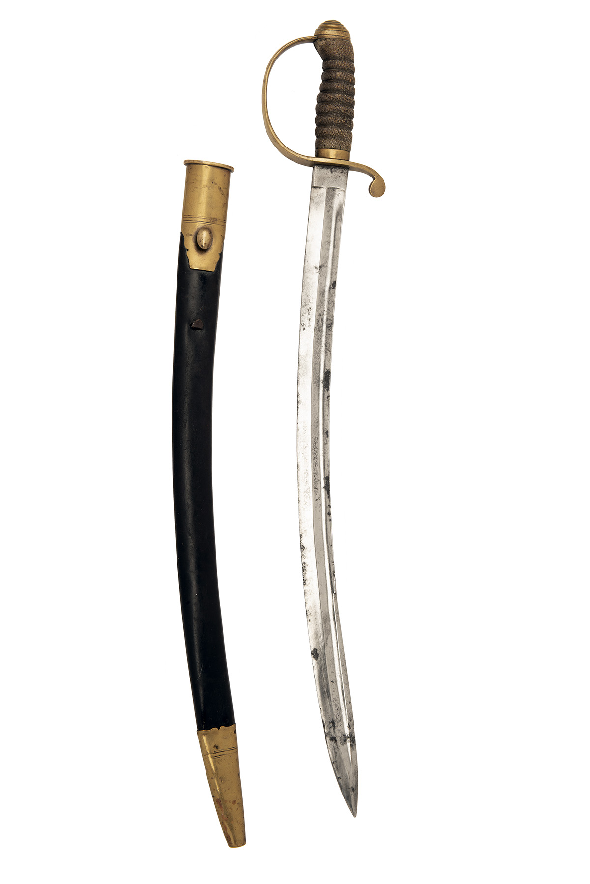 circa 1855, with curved broad fullered 23 1/2in. spear-point blade false edged for the last 8 1/4in., plain 'D' shaped knucklebow with turned down quillion to the cross-guard, ribbed sharkskin grip (binding absent) and carved brass pommel, complete with its black leather brass mounted scabbard (missing locking catch, scabbard stitching undone)