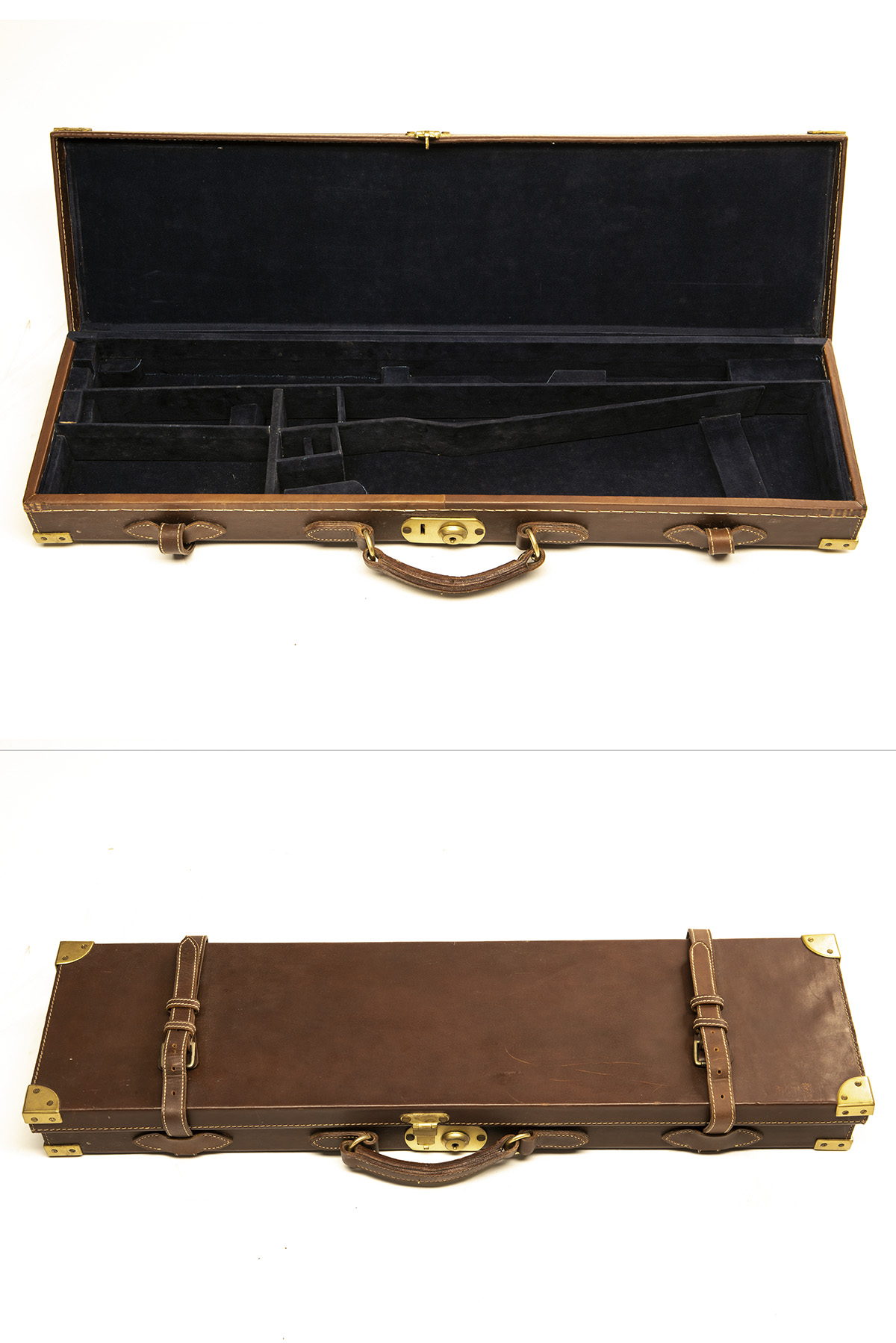 fitted for 30in. barrels, the interior lined with blue velvet, brass lock (key missing)
