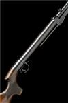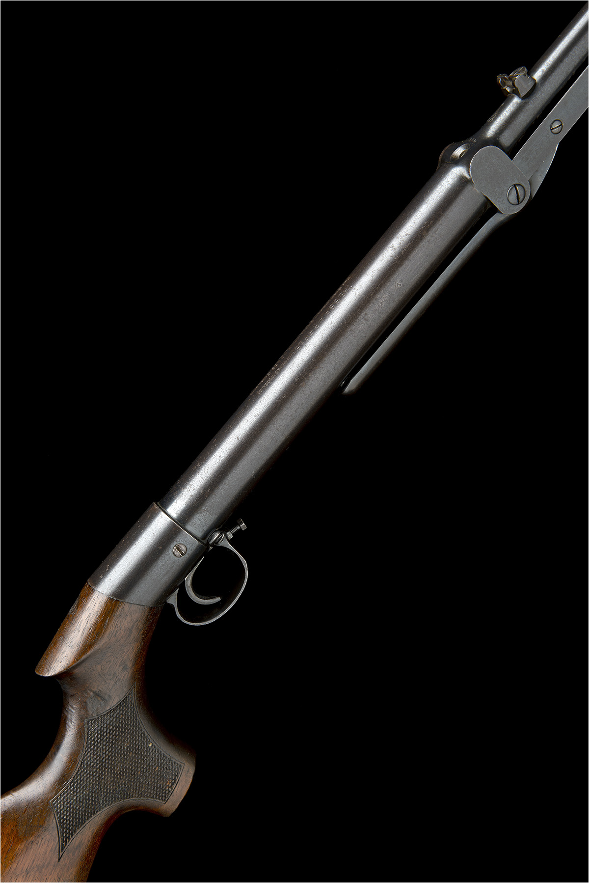 for 1909, 43in. overall and with tapering 19 1/2in. barrel, dove-tailed blade fore-sight, elevating notch rear-sight, loading tap at breech, plain air-chamber roll-stamped 'THE BSA AIR-RIFLE (IMPROVED MODEL 'D'), THE BIRMINGHAM SMALL ARMS CO. LTD. ENGLAND, SOLE MANUFACTURERS', walnut saw-handled chequered pistol-grip butt-stock, moulded iron trigger-guard bow with front trigger-weight adjusting screw, no provision for fore-end and 'spade' style under-lever, the whole retaining a strong amount of original blued finish