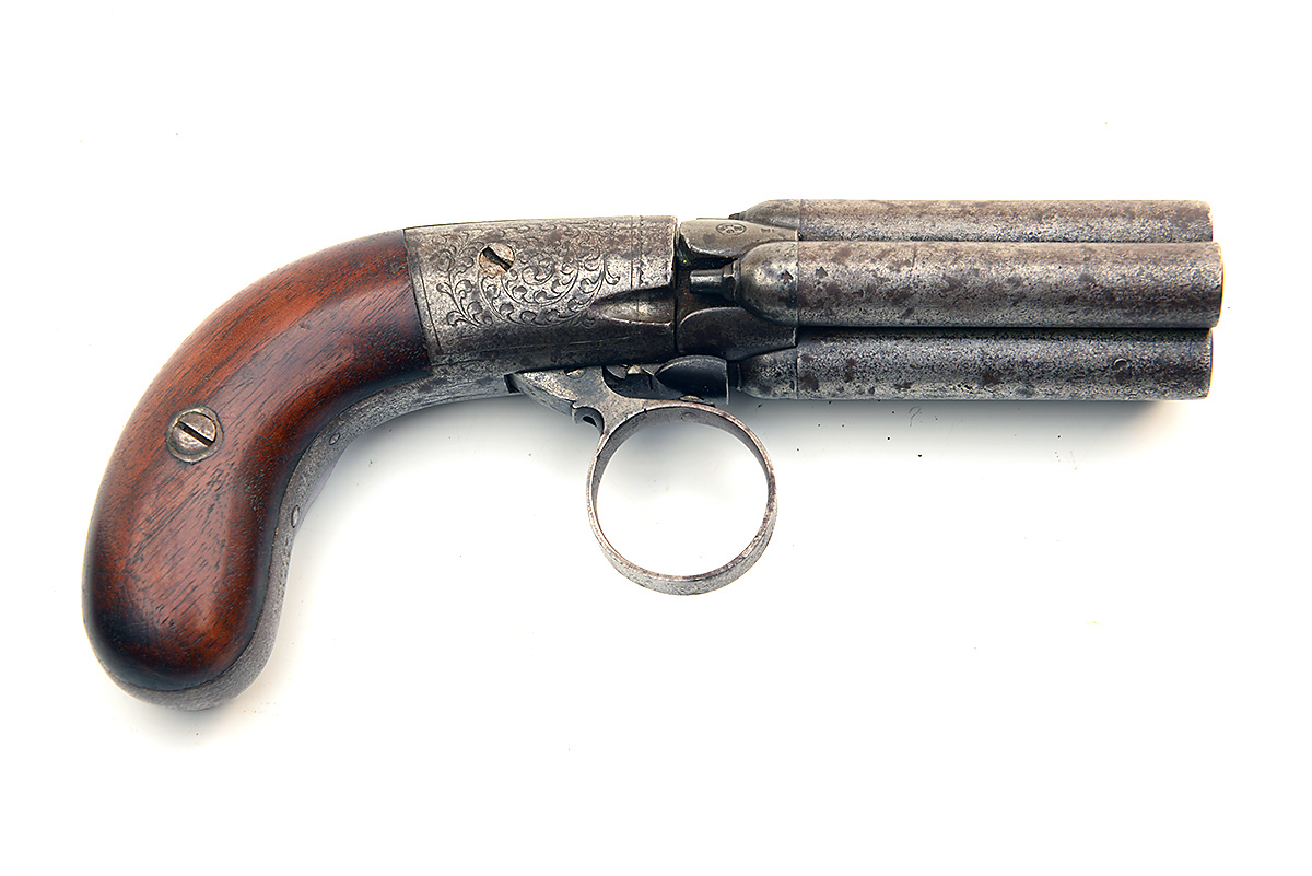 A 60-BORE PERCUSSION FOUR-BARRELLED PEPPERBOX REVOLVER, UNSIGNED, MODEL MARIETTE PATENT serial no. 374,