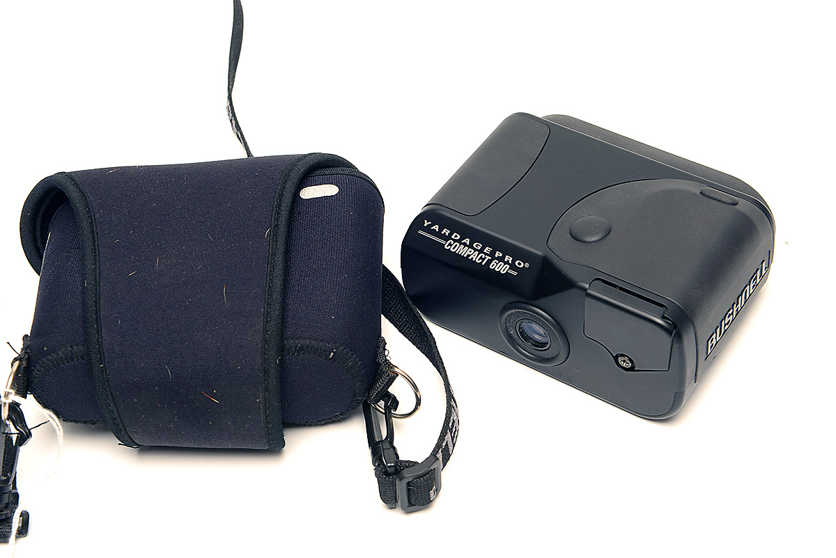 A BUSHNELL YARDAGE PRO COMPACT 600 RANGE FINDER, including markers carry case, including instructions for use