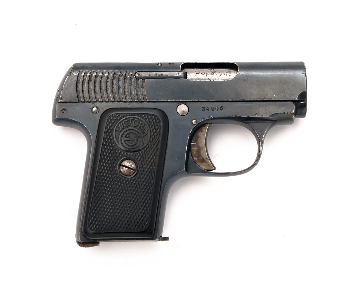'VICTORIA PATENT' 6.35mm (.25 ACP) '1911 MODEL' SEMI-AUTOMATIC PISTOL, RETAILED BY W.R. PAPE, serial no. 34405, 2 1/8in. barrel marked 'HOPE', blued slide the top marked 'W.R. PAPE. NEWCASTLE-UPON-TYNE', the left-hand side marked '6.35 1911 MODEL AUTOMATIC PISTOL 'VICTORIA PATENT', side-safety with 'SAFE' and 'FIRE' details, colour-hardened trigger, heel-release magazine, chequered hard rubber grips with 'VICTORIA' logo, the whole retaining much finish