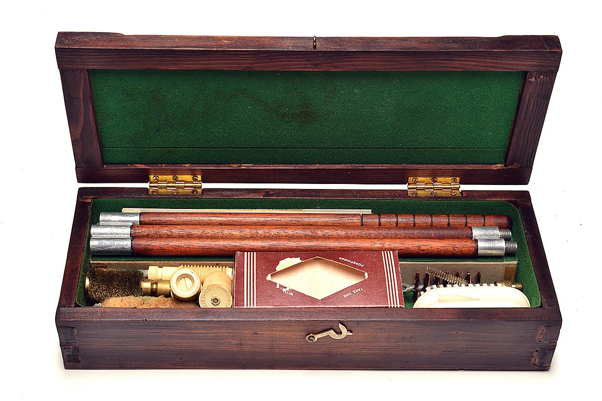TWO 12-BORE GUN-CLEANING KITS, comprising of a cased cleaning kit with three-piece cleaning rod, brush, jag, mop, chamber brush, snap-caps, patches, set in a green baize lined wooden case, together with a Parker-Hale Cleaning kit