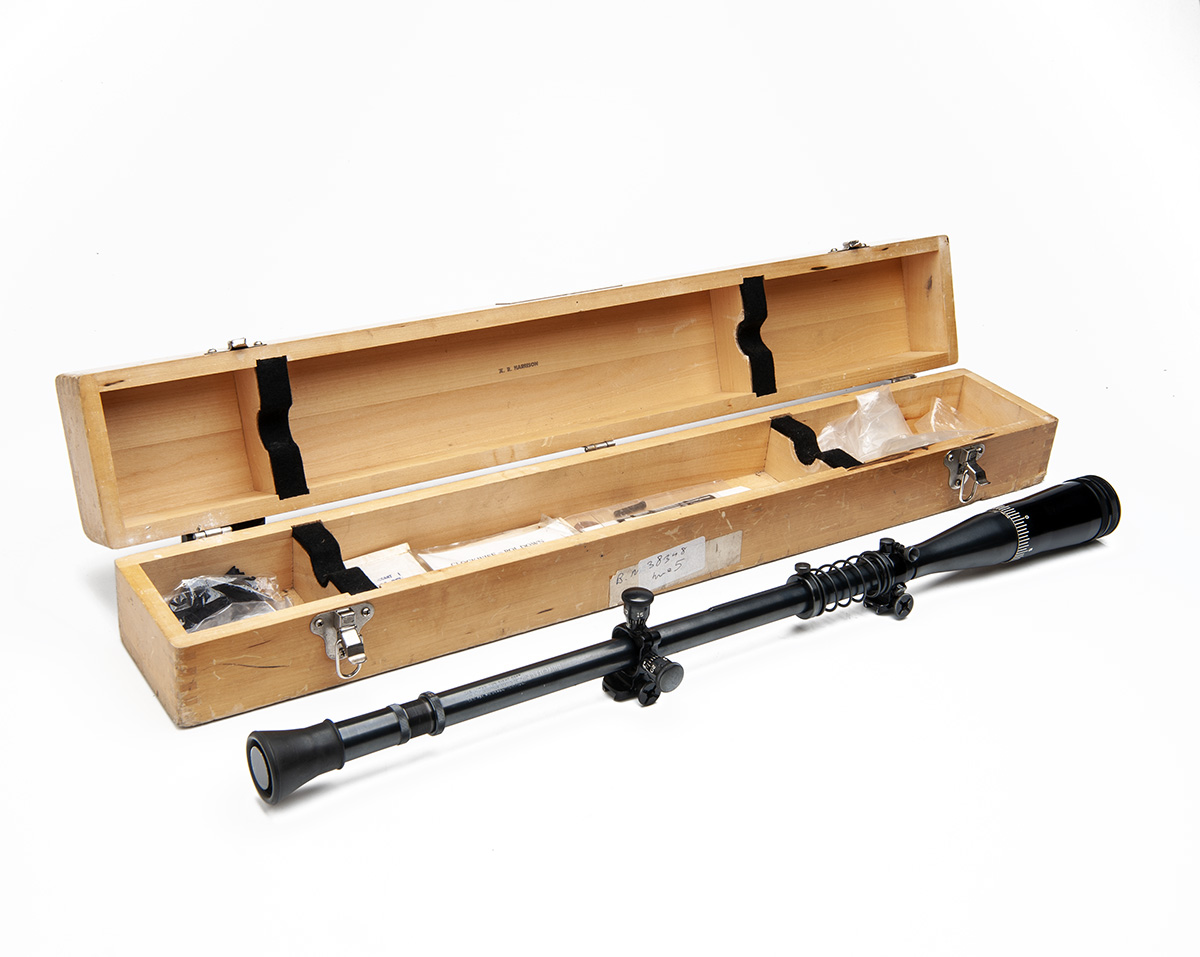 with cross hairs reticle, measuring approx. 24 1/4in., 1 3/4in. flared objective lens, 7/8in. tube, with screw off lens covers, recoil spring, vernier adjustable mounts and complete with fitted with wooden box