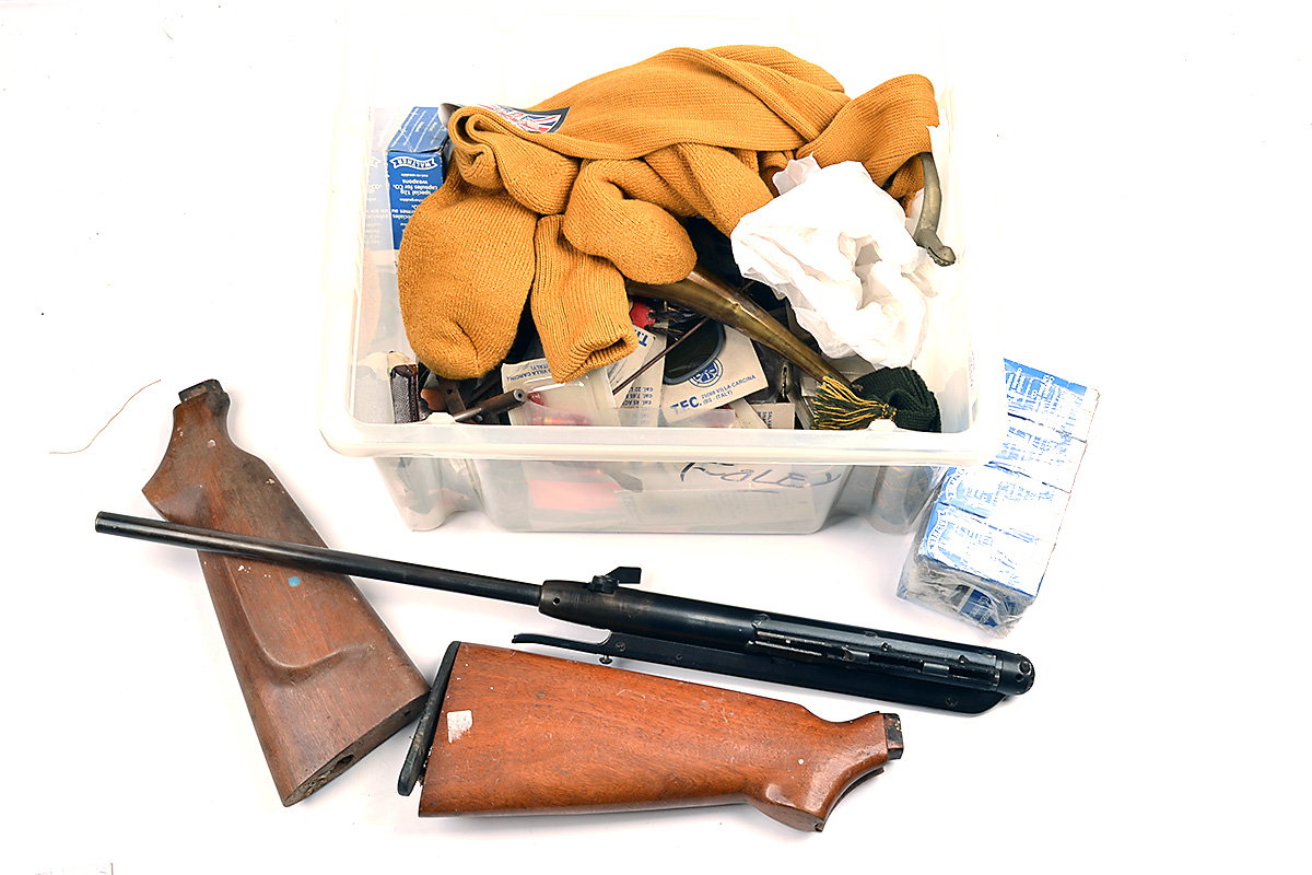 A COLLECTION OF SHOOTING RELATED ITEMS, comprising of shooting socks, 40 x co2 air capsules, vintage spurs, a collection of .45 snap-caps, Jackal air rifle barrel, pistolgrips, double triggers
