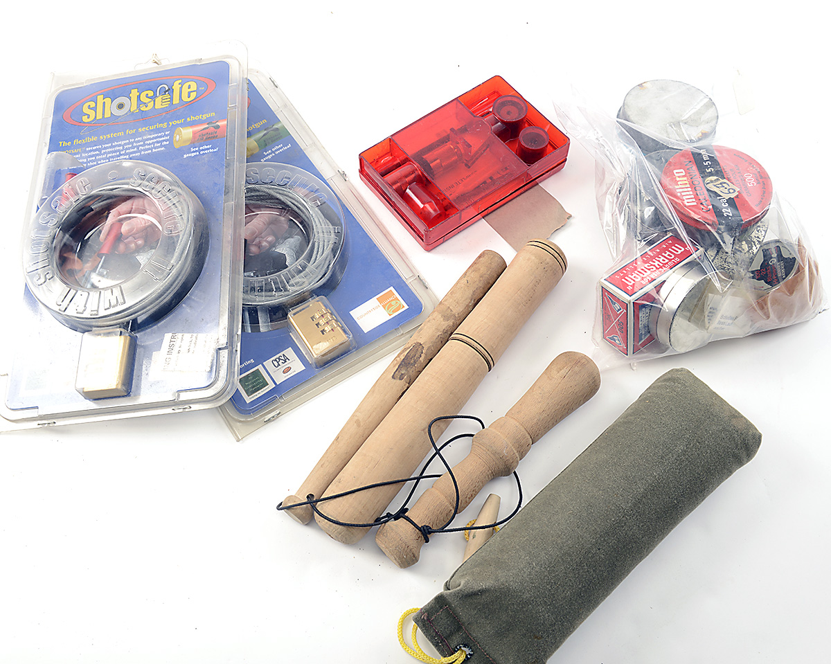 A COLLECTION OF SHOOTING RELATED ITEMS, comprising of 2 'Shotsafe' cable & padlock shotgun security devices (new In packaging), a dummy for gun dog retrieving training together with three wooden priests for the dispatch of wounded game (unused),