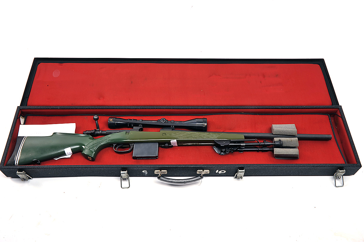 PARKER-HALE 7.62mm BOLT-MAGAZINE METROPOLITAN POLICE SNIPER TYPE' RIFLE, serial no. C09547, 23 1/2in. unsighted nitro barrel, fitted with a Pecar Berlin variable 4/10 telescopic sight, manual safety, folding bipod, detachable magazine, green pistolgrip stock with adjustable butt with recoil pad, together with full-length case