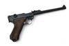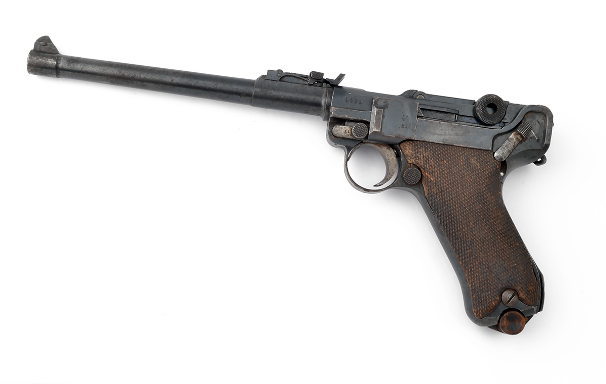 A 9mm (PARA) SEMI-AUTOMATIC SERVICE-PISTOL SIGNED 'DWM', MODEL 'P08 LANGE' or 'ARTILLERY LUGER', serial no. 1581, dated for 1917, with blued 8in. barrel, dove-tailed blade fore-sight, elevating tangent rear-sight, blued receiver, chequered walnut grips, all matching numbers except period magazine
