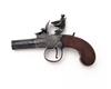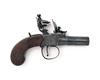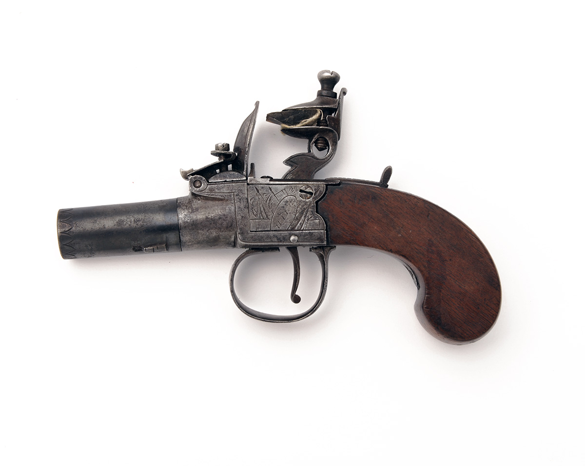 A 46-BORE FLINTLOCK BOXLOCK POCKET-PISTOL SIGNED HILL, LONDON, no visible serial number, circa 1800, with blued turn-off 1 5/8in. barrel, engraved and signed central hammer boxlock action with guarded trigger and walnut slab-sided butt