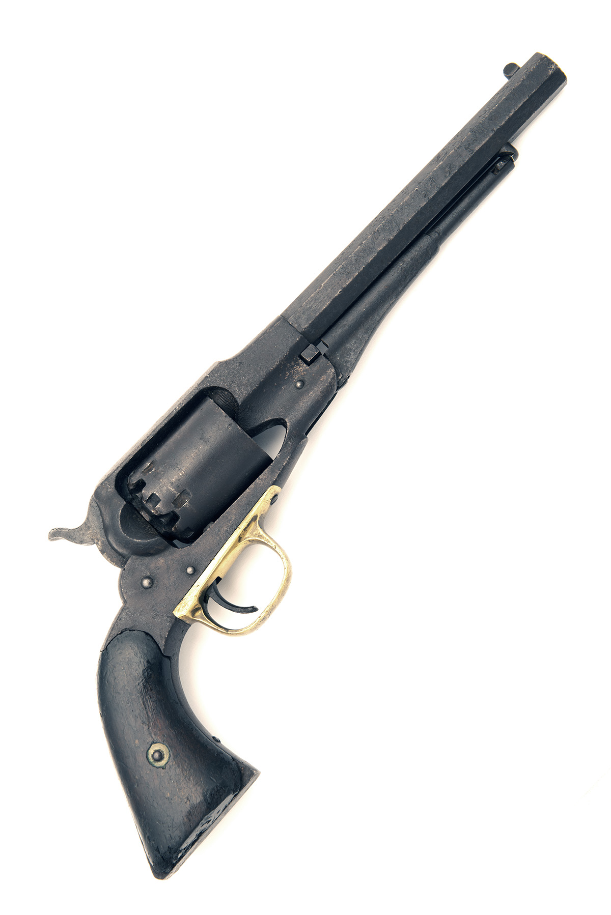 for between 1863-78, with 7 3/8in. octagonal barrel signed by the maker and marked 'NEW MODEL', pinched blade fore-sight, small anchor mark near breech, top-strap with sighting groove, solid iron frame, plain six-shot cylinder with safety notches, brass trigger guard and smooth walnut grips (iron surfaces darkly stained, grips worn)