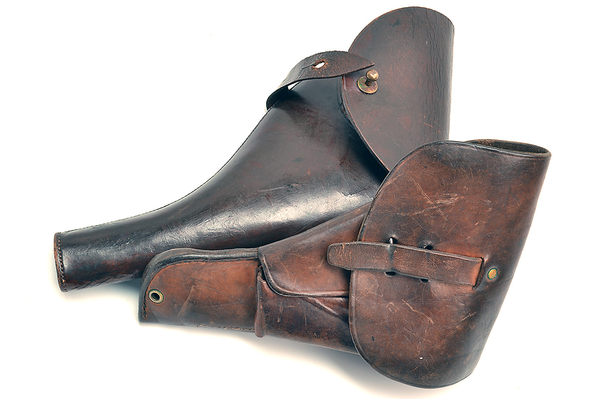 TWO FULL-FLAP LEATHER HOLSTERS, the first a WW1 revolver holster for a Webley Wilkinson revolver, the second for a 1911 type semi automatic pistol with spurious nazi marks on reverse