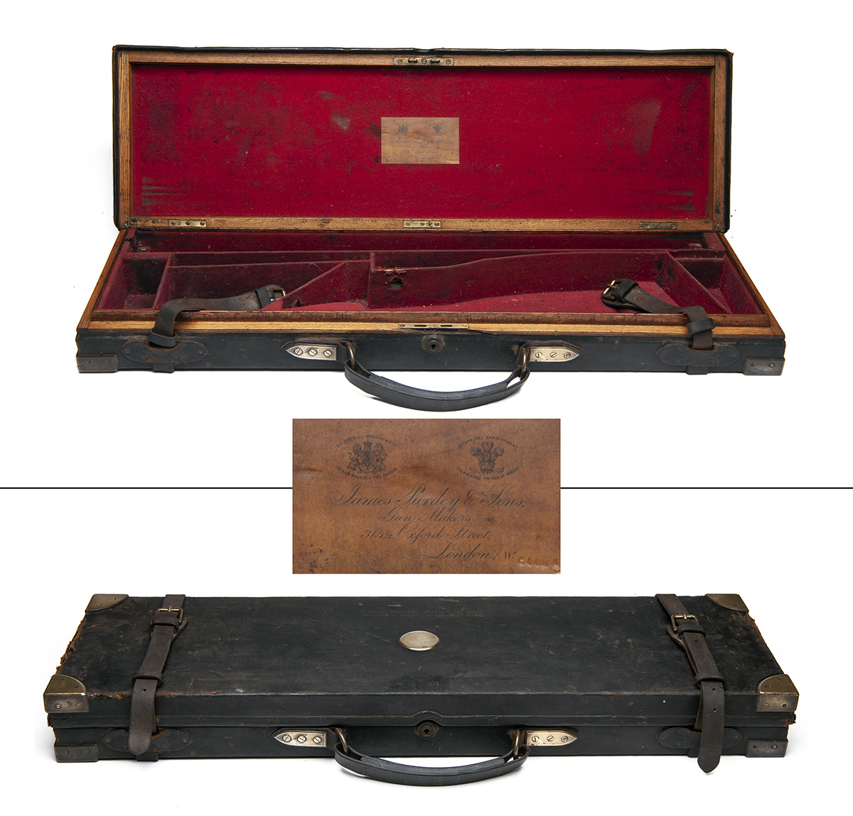 fitted for 30in. side by side barrels, the interior lined with red baize a James Purdey & Sons trade label, central brass push-button lock (key missing), the lid exterior embossed with 'WALTER WINANS' and with a central brass blank escutcheon