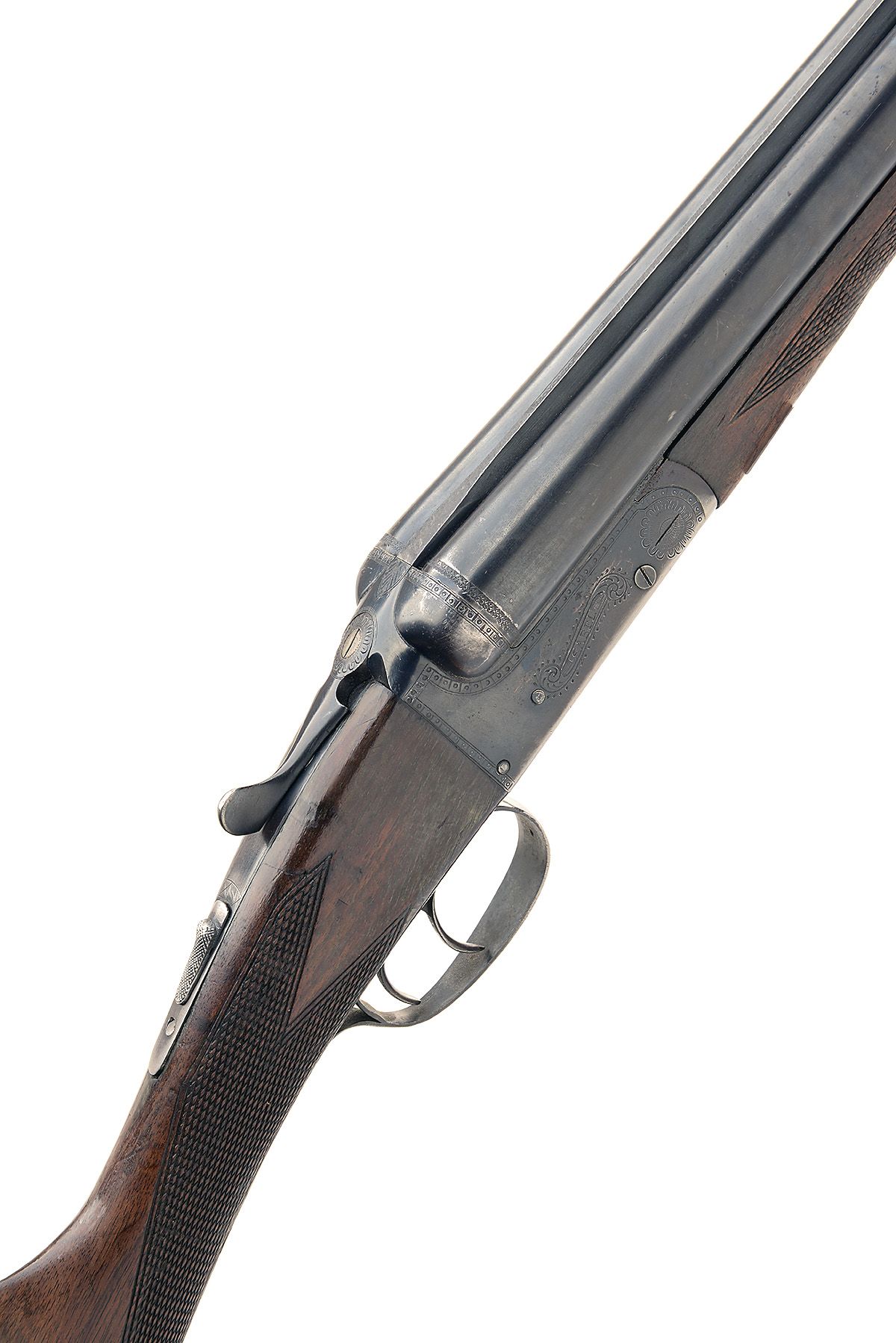 GUNMARK 12-BORE 'SABEL EJECTOR' BOXLOCK EJECTOR, serial no. 91195, 27in. nitro barrels, 2 3/4in. chambers, bored approx. true cyl. and 1/4 choke, removable striker discs, automatic safety, beaded border engraving, blacked finish, 14 1/4in. stock