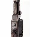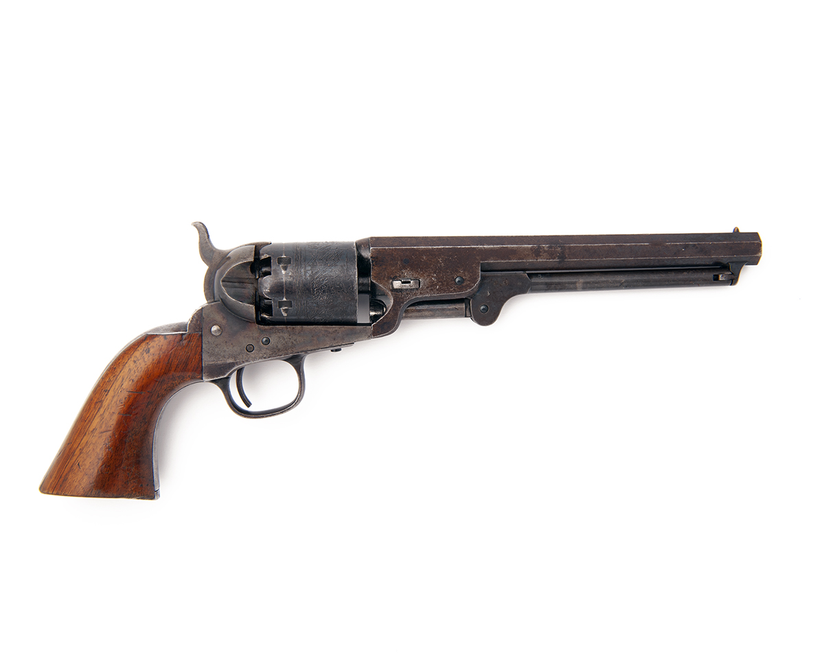 Belgian, circa 1865, with blued 7 1/2in. octagonal barrel signed 'ADDRESS COL. SAML. COLT NEW-YORK U.S. AMERICA', articulated under-barrel rammer, colour-hardened open iron frame marked 'COLT'S PATENT', blued cylinder with roll engraved naval scene, iron grip-straps and trigger guard, smooth walnut grips, the whole retaining a strong amount of original finish and colour