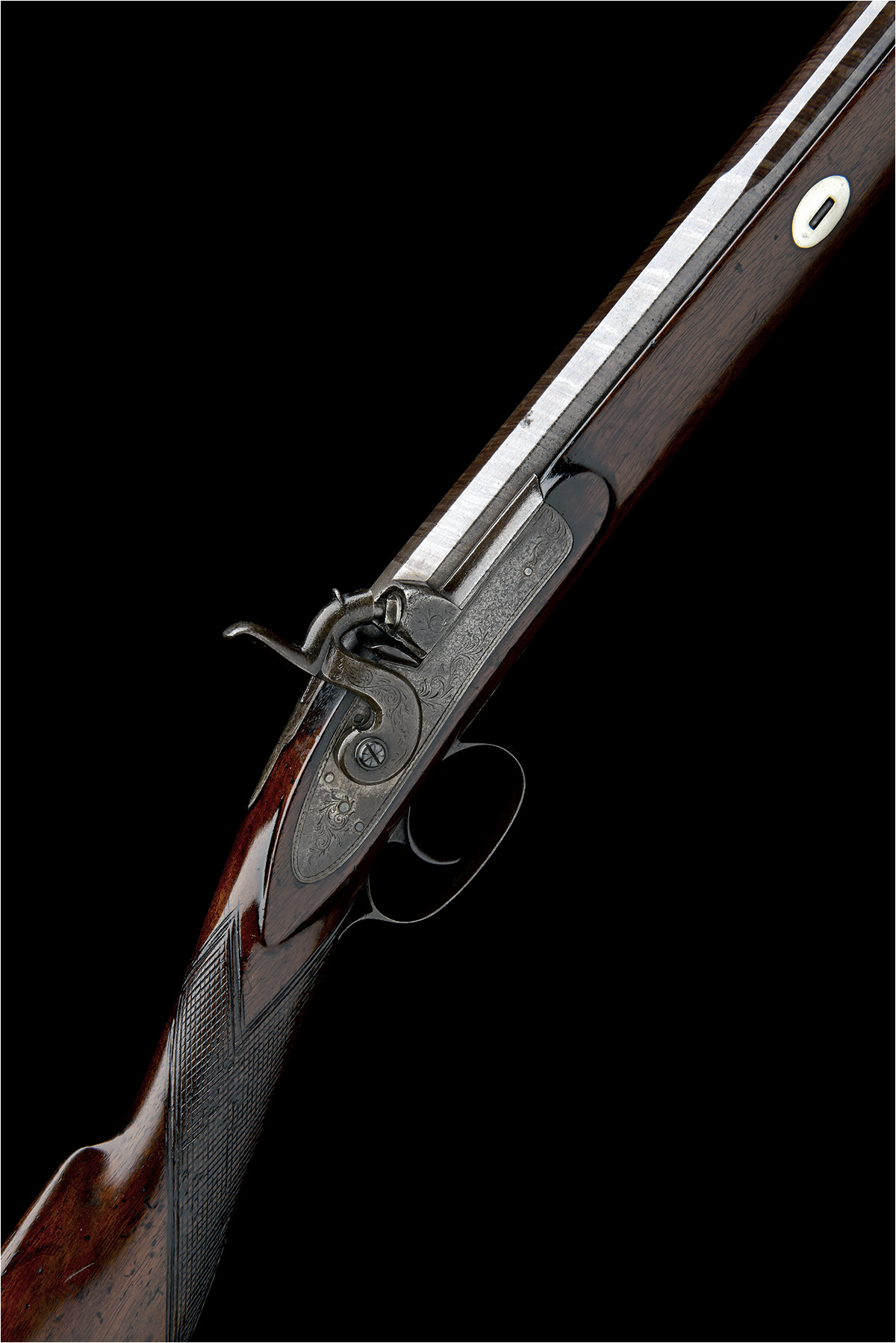 English circa 1845, with triple-staged re-browned 34in. barrel, squared patent breech, engraved top-tang, border and scroll engraved bar-action lock, scroll engraved slab-sided hammer, walnut half-stock chequered at the wrist, iron furniture, white-metal barrel key escutcheons and nose-cap, brass tipped ebony ramrod