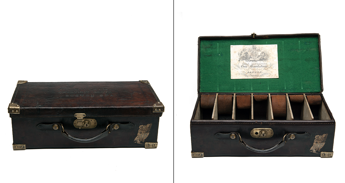 for approx. 500 cartridges, a Chas. Lancaster trade label, six canvas removable dividers, seven leather lifters, the lid exterior embossed with 'T.L. WICKHAM CHESTNUT GROVE BOSTON SPA'