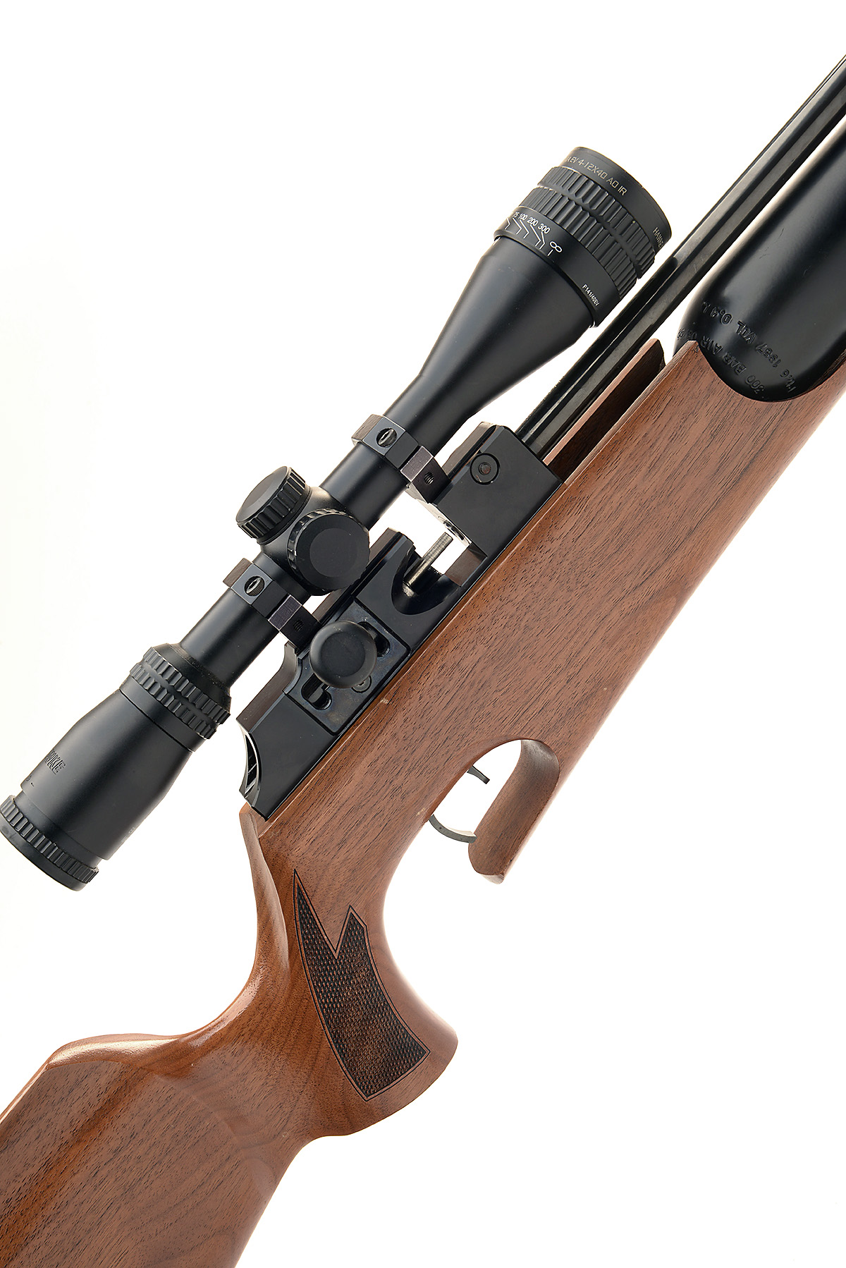 AN FAC RATED .177 PRE-CHARGED PNEUMATIC AIR-RIFLE SIGNED THEOBEN, MODEL 'RAPID', serial no. 024096, with 30in. barrel including built-on sound-moderator, machined receiver with oversize bolt handle and machined cut-out for single load, large size air-reservoir and walnut half-stock, complete with a 17-shot magazine and fitted with a HAWKE 4-12x40 telescopic sight