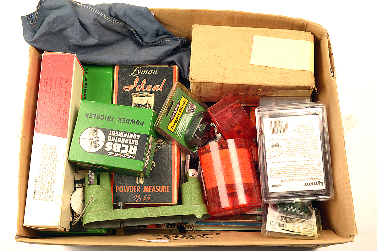 A COLLECTION OF CARTRIDGE RELOADING ITEMS, comprising of reloading dies, 3 x unused Remington trigger blocks, RCBS powder scales, Lee bullet mould, RCBS poder trickler, knoblock glasses, RCBS iniflow powder measure, lyman powder measure, a collection of Cartridges of the world catalogues