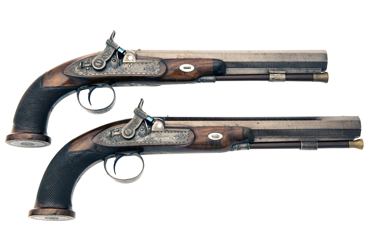 AN EXCEPTIONAL CASED PAIR OF 18-BORE PERCUSSION DUELLING-PISTOLS, serial no's. 5317,