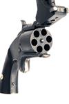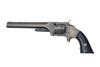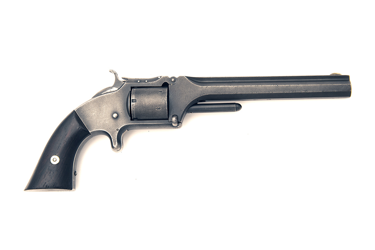 circa 1865, with octagonal 6in. barrel hinging upwards at rear (drilled through at breech-end), raised sighting rib with applied nickel crescent fore-sight and signed 'SMITH & WESSON, SPRINGFIELD MASS.', plain six-shot cylinder roll engraved with the Rollin White patent details, period London proofs, plain iron frame, three pin cylinder stop, central hammer, spur trigger and smooth walnut grips (one cracked and repaired), the back-strap engraved 'I.H. CRANE, SOLE AGENT, 3 ROYAL EXCHANGE E.C.', refinished in antiquity