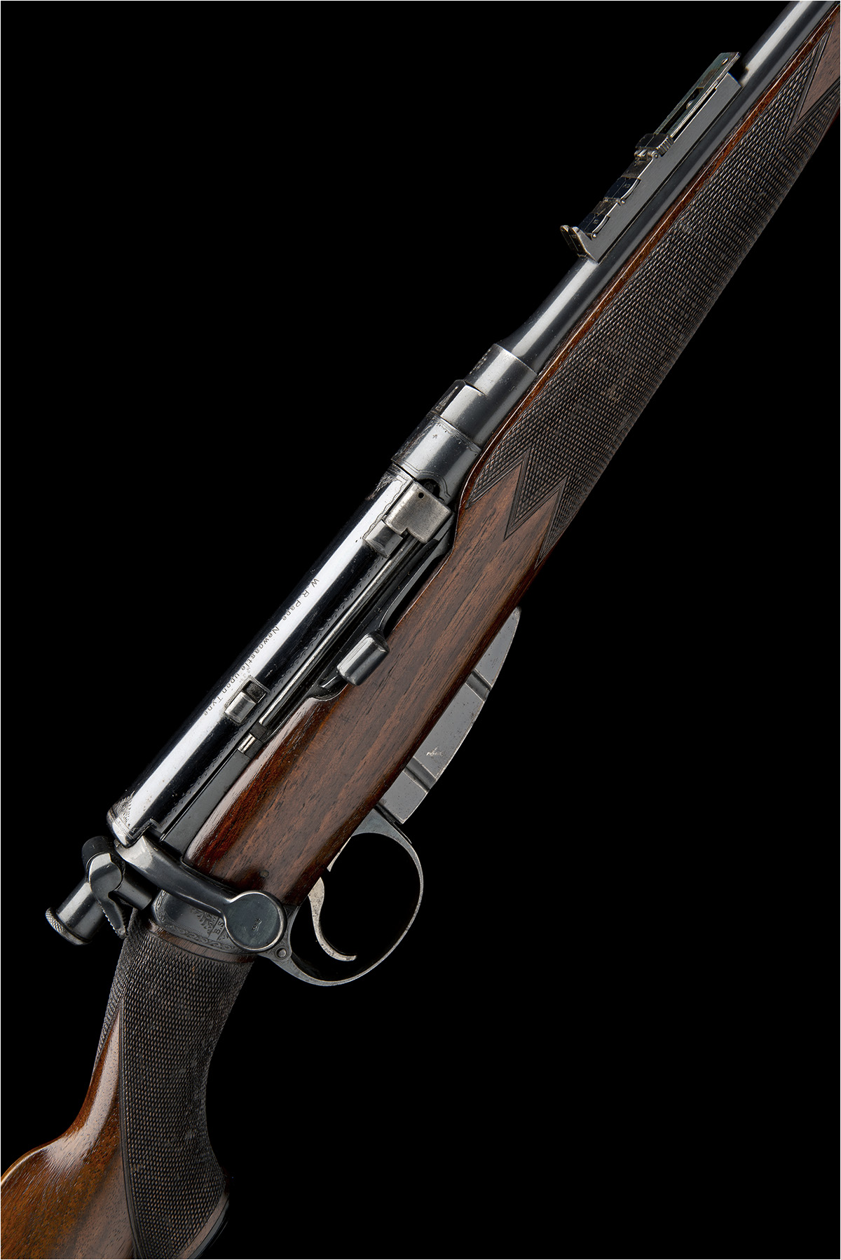 24 3/4in. nitro reproved barrel (in 2019) with the BSA piled arms logo at the knox form, open sights with two folding leaf sights with white metal sight lines and marked 100,200 and 300, with folding tangent sights marked 4-10, block-mounted fore-sight with protecting ears, bolt shroud with border engraving and marked 'W.R. Pape Newcastle Upon Tyne', the wrist band with ornate border and scroll work with 'B.S.A. Co.' to the right side and BSA number 13466, magazine cut-off, detachable magazine with border and scroll engraved base, the magazine housing with border engraving, the triggerguard with the serial number and border and scroll engraving, retaining traces of finish, 14 1/4in. well-figured pistolgrip stock with pistolgrip-cap, sling eyes and steel buttplate (with trap), weight 7lb. 6oz.