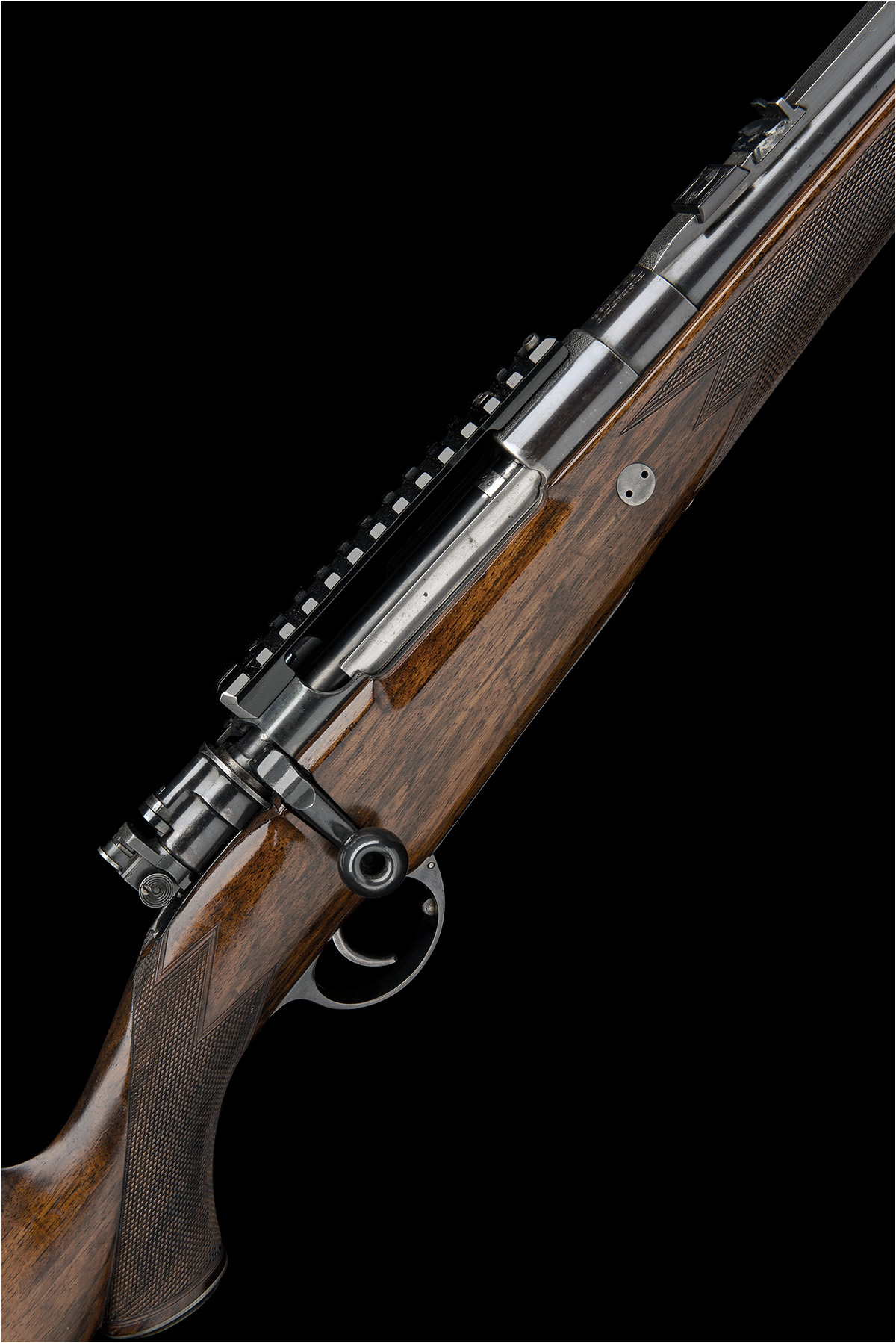 24 3/4in. nitro reproved barrel engraved 'HOLLAND & HOLLAND. 98. NEW BOND ST. LONDON.', the knox form engraved 'HOLLAND'S .30 SUPER RIMLESS CARTRIDGE', matt sight rib with front claw mount base, open sights and folding leaf sight with white metal inlaid sight lines and marked '50 / 200' and '350', the muzzle threaded and with protecting cap, ramp-mounted bead fore-sight with folding protector hood (ramp loose on barrel), receiver (with thumb cutout) with matt top receiver ring, mounted with a picatinny rail (rear claw mount base and two claw mounts also supplied), the bolt with adjustable peep sight, recoil blocks, hinged floorplate engraved '4 CTGES' and with push button release, well-figured pistolgrip stock with cheekpiece, colour-hardened steel pistolgrip-cap (with trap), sling eyes, 14 3/4in. pull including 1in. leather covered recoil pad, weight 8lb. 1oz.