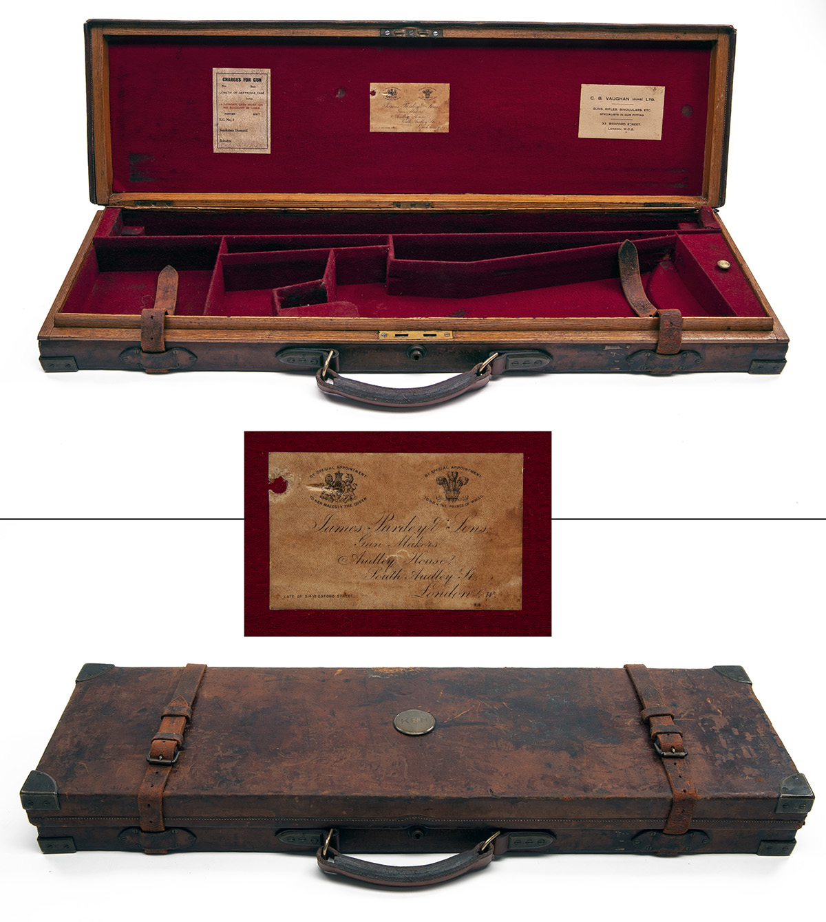 fitted for 30in. barrels, the interior lined with red baize, a James Purdey & Sons trade label, central brass push-button lock (key missing), the lid exterior lid with a central brass escutcheon with 'K.R.M.'