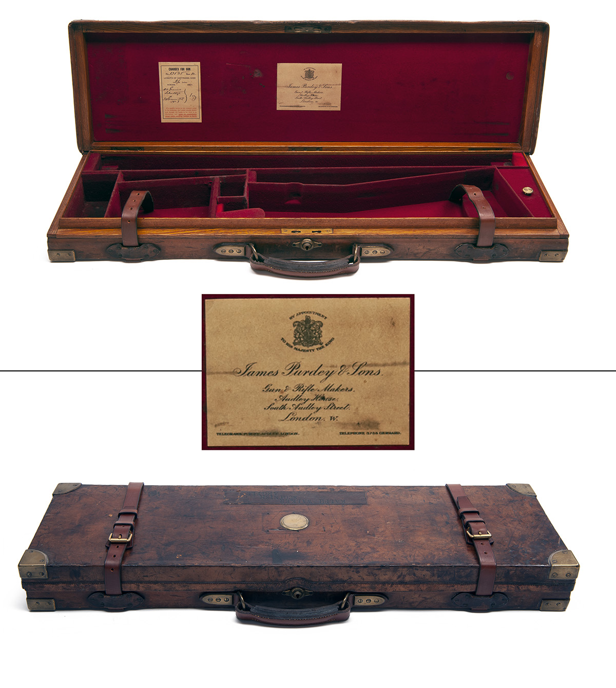 fitted for 30in. barrels, the interior lined with red baize, a James Purdey & Sons trade label, central brass push-button lock (key missing), the lid exterior with 'Ralph Walker Scottish Argyll' and with a central blank brass escutcheon