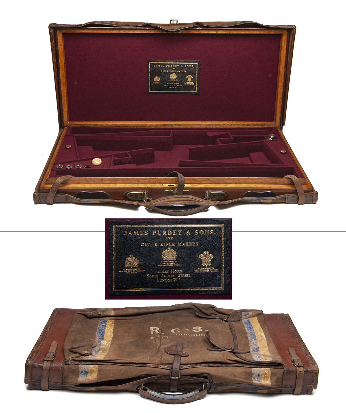 fitted for 28in. barrels, the interior lined with maroon baize, a leather gold-tooled James Purdey & Sons trade label, oil bottle, three 12-bore snap-caps, striker pot, central brass push-button lock (including keys), the lid exterior with 'R.C-S. Scots Guards', central blank brass escutcheon, with a canvas and leather outer