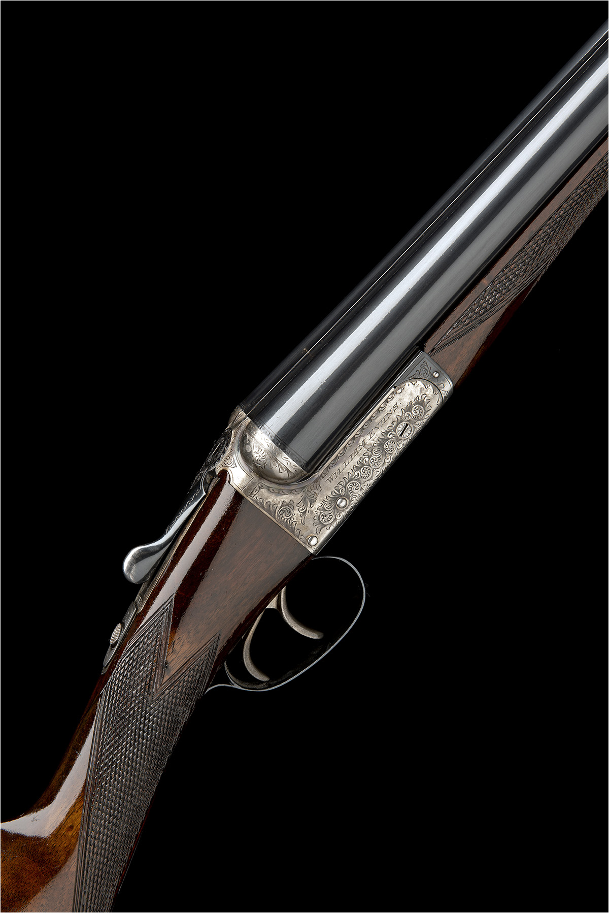 26in. nitro barrels, the rib engraved 'WILLIAM EVANS. 67A ST. JAMES'S STREET. LONDON. S.W.1.', 2 1/2in. chambers bored approx. imp. cyl. and 1/4 choke, automatic safety, border and acanthus scroll engraving, retaining traces of original colour-hardening and finish, 15in. stock including buttplate, weight 6lb. 10oz., in a leather hammergun case with William Evans trade label
