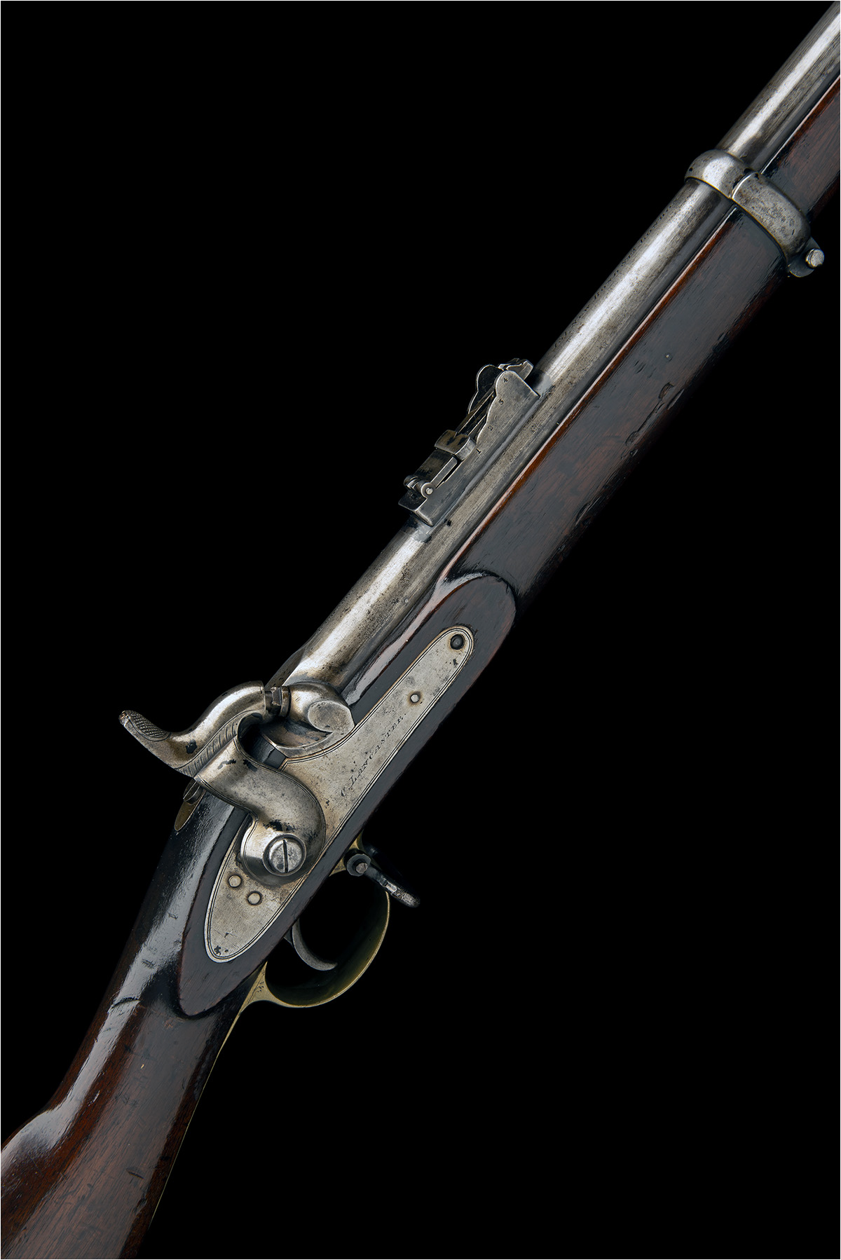 fully provenanced from the 1862 rifle trials, with 39in. oval-bored barrel signed 'LANCASTER'S PATENT' at breech and '151 NEW BOND ST'T LONDON' forwards of the rear-sight, block and blade fore-sight, 800 yard lader rear-sight, London proofs as a '25-bore' at breech, solid top-tang, borderline engraved bar-action lock and hammer, the bar signed 'C. LANCASTER', walnut three-quarter stock of Pattern '53 type with brass furniture, the heel-plate numbered '4' on the spur and with a Pattern Room inventory number painted to the toe, three iron barrel-bands and iron jag-ended ramrod, strong traces of finish throughout and together with an extensive file of research on the rifle together with a copy of the original receipt of purchase from the Pattern Room dated 1983 and a copy of the entry for rifle number '5' from the Enfield Pattern Room catalogue
