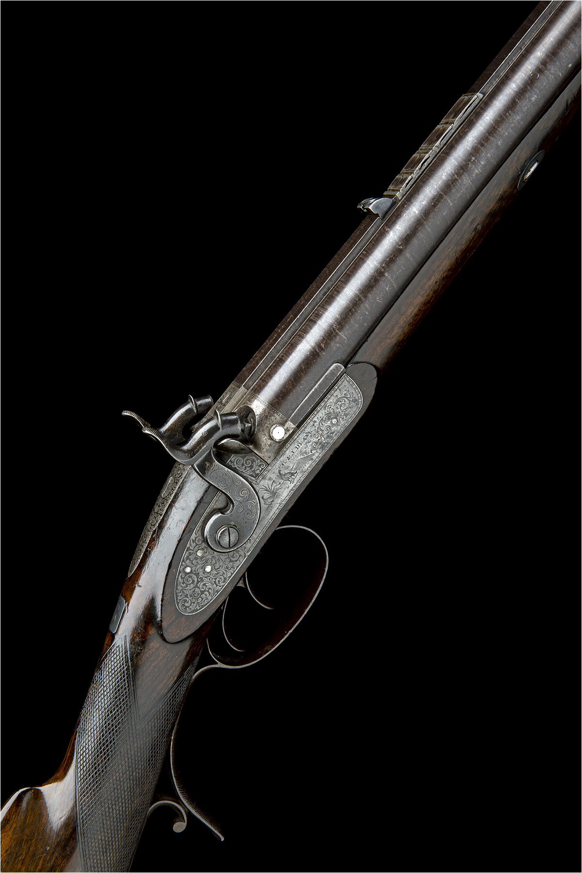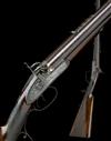 circa 1855, with browned 29 1/2in. multi-groove rifled barrel combined with a smooth barrel for shot, the flat top-rib signed 'GEO. & JNO. DEANE, 46 KING WILLIAM ST. LONDON BRIDGE', dove-tailed white metal beaded fore-sight, rear-sight with one standing notch and four flush-folding leaves, border and shell engraving at breech, platinum vented plugs, fully scroll engraved top-tang, border and scroll engraved bar-action locks signed 'G. & J. DEANE' and additionally engraved with a bolting stag on the left lock and a pair of gamebirds on the right, walnut half-stock chequered at the wrist, iron furniture including chequered pistol-grip spur to the lower tang and complete with its original brass mounted ebony ramrod, strong traces of original finish remaining
