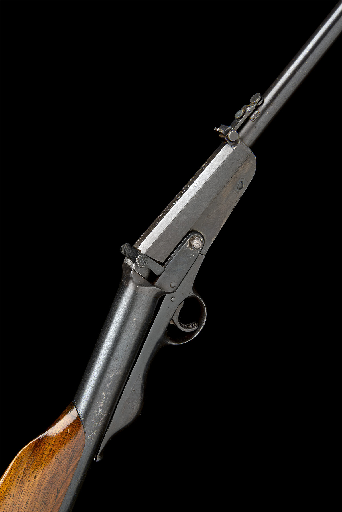 circa 1907, with two stage 20 1/2in. barrel, dove-tailed front and adjustable rear-sights, the top-flat signed 'ANGLO SURE-SHOT MARK 1, MADE ONLY FOR R. RAMSBOTTOM, MANCHESTER' and 'COX'S PATENT', the side of breech stamped 'THE BRITANNIA' surrounding a seated figure of Britannia bisecting the legend 'REGD TRADE MARK', stirrup barrel locking latch, slanted air-chamber with applied walnut comb, cocking link housing the trigger-unit stamped 'RD394207', the whole re-finished