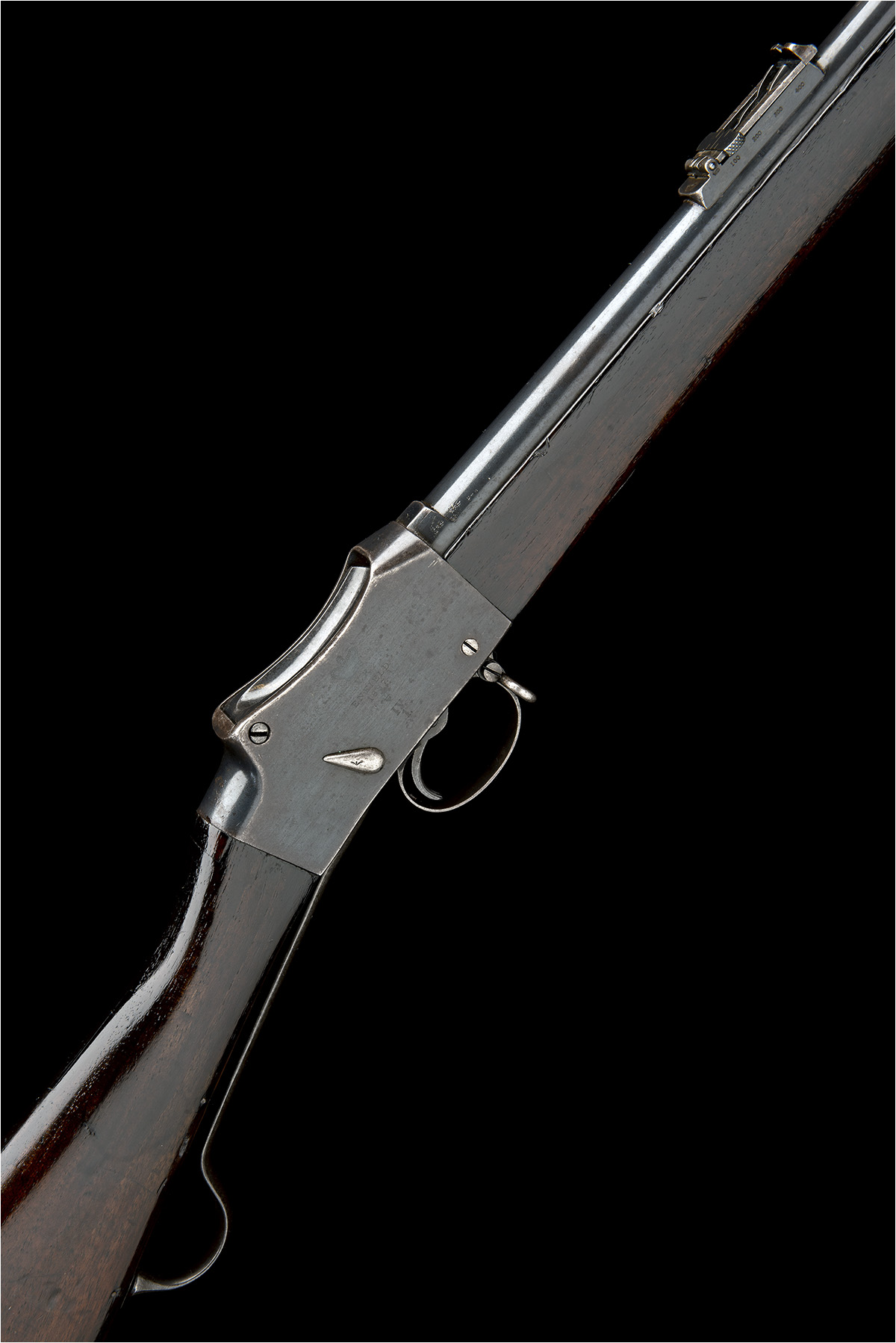 dated for 1887, with blued 33in. barrel, block and blade fore-sight, elevating ladder rear-sight, signed and dated slab-sided receiver with dropping feed-ramp and tear-drop cocking indicator, walnut butt-stock with Egyptian markings and rework stamps for 1906, long under-lever, full-length fore-end with twin iron barrel-bands and iron under-barrel clearing rod