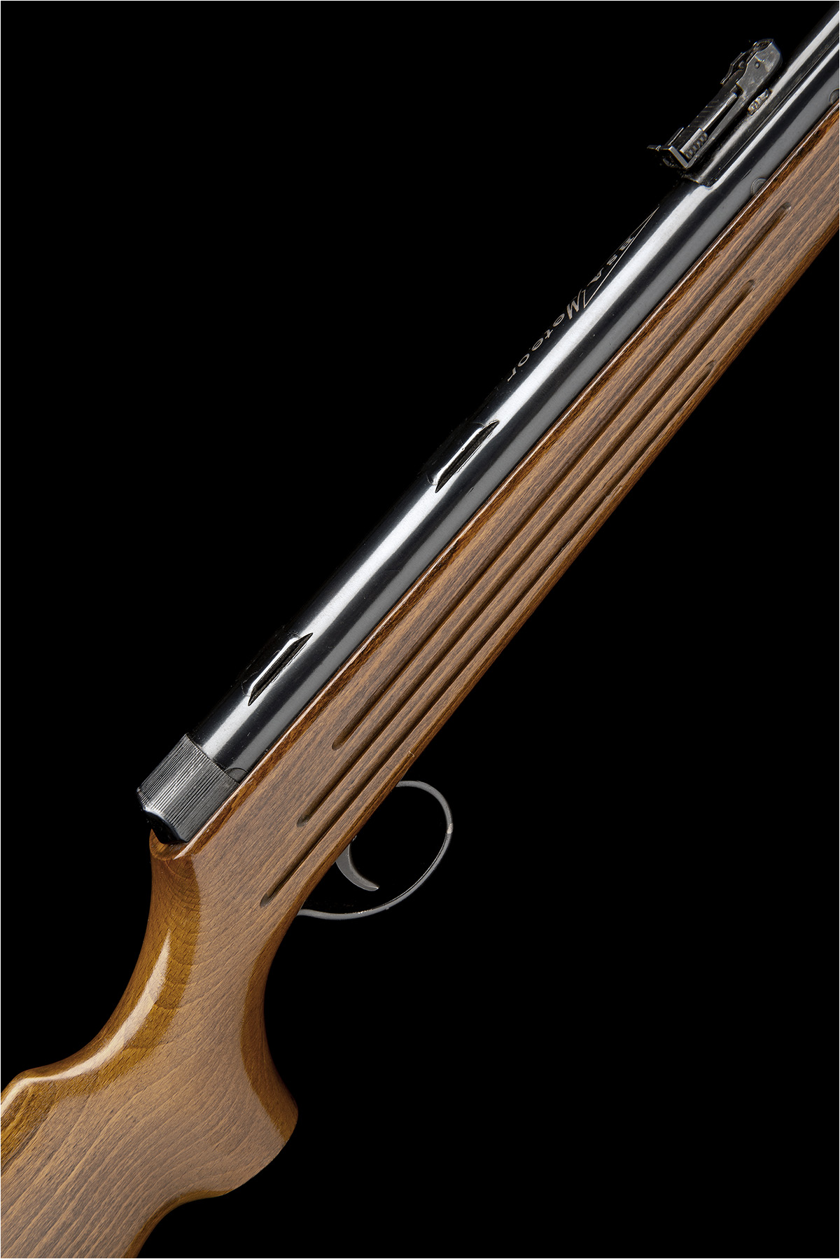 with blued 18in. barrel, ramp and blade fore-sight, elevating rear-sight, blued air-chamber etched with the model name and the BSA 'arrow' trademark, two-piece divided telescopic sight rail, steel end-cap, beech half-stock with grooved fore-end, collectors condition throughout