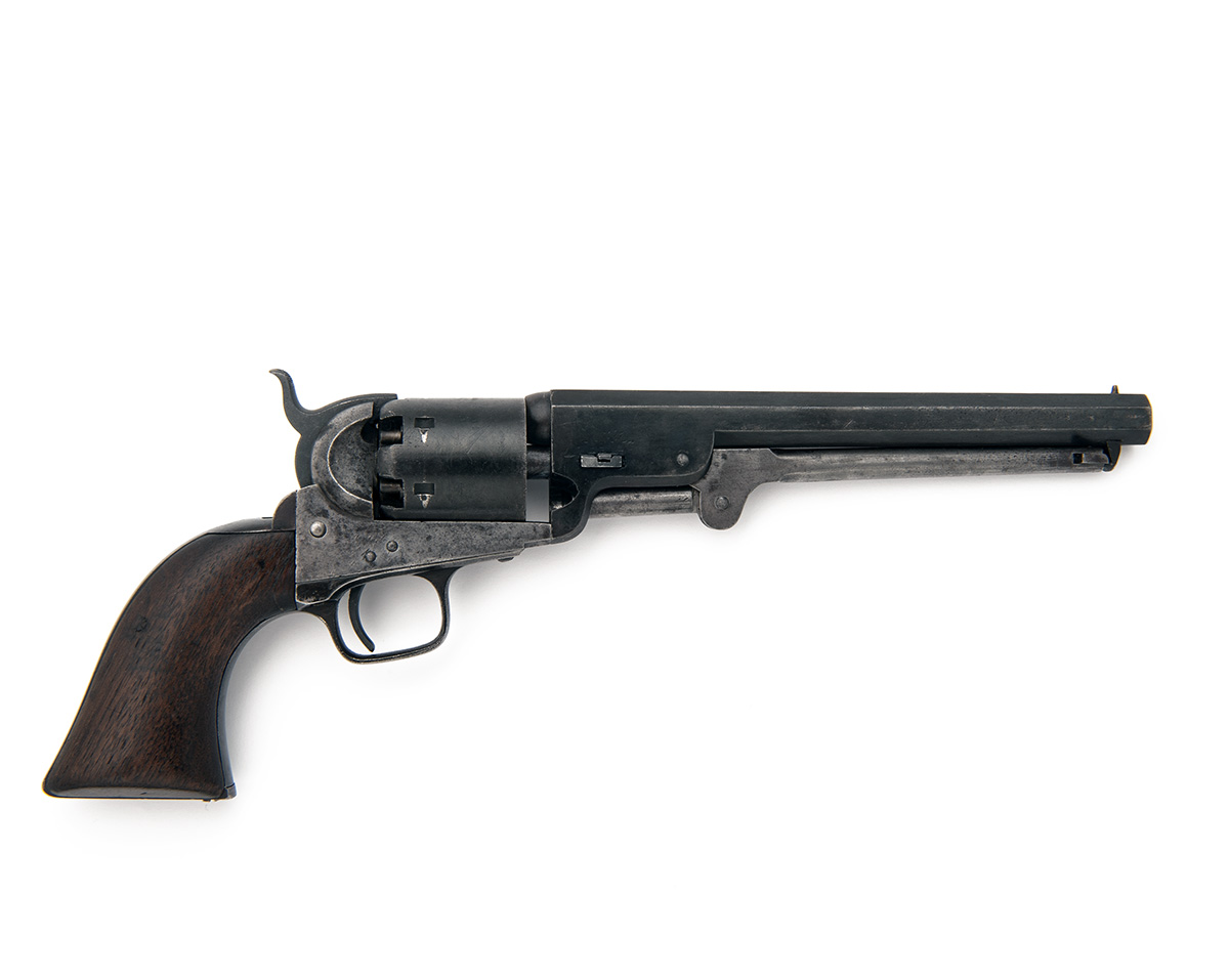 for 1855, with octagonal 7 1/2in. barrel, the top-flat signed 'ADDRESS COL. COLT, LONDON', bead fore-sight, London proofs, plain roll engraved cylinder (loss to detail), open iron frame marked 'COLT'S PATENT', dome headed action screws, iron grip-straps and trigger-guard, hinged under-barrel rammer and smooth walnut grips, older re-finish with some mild pitting.