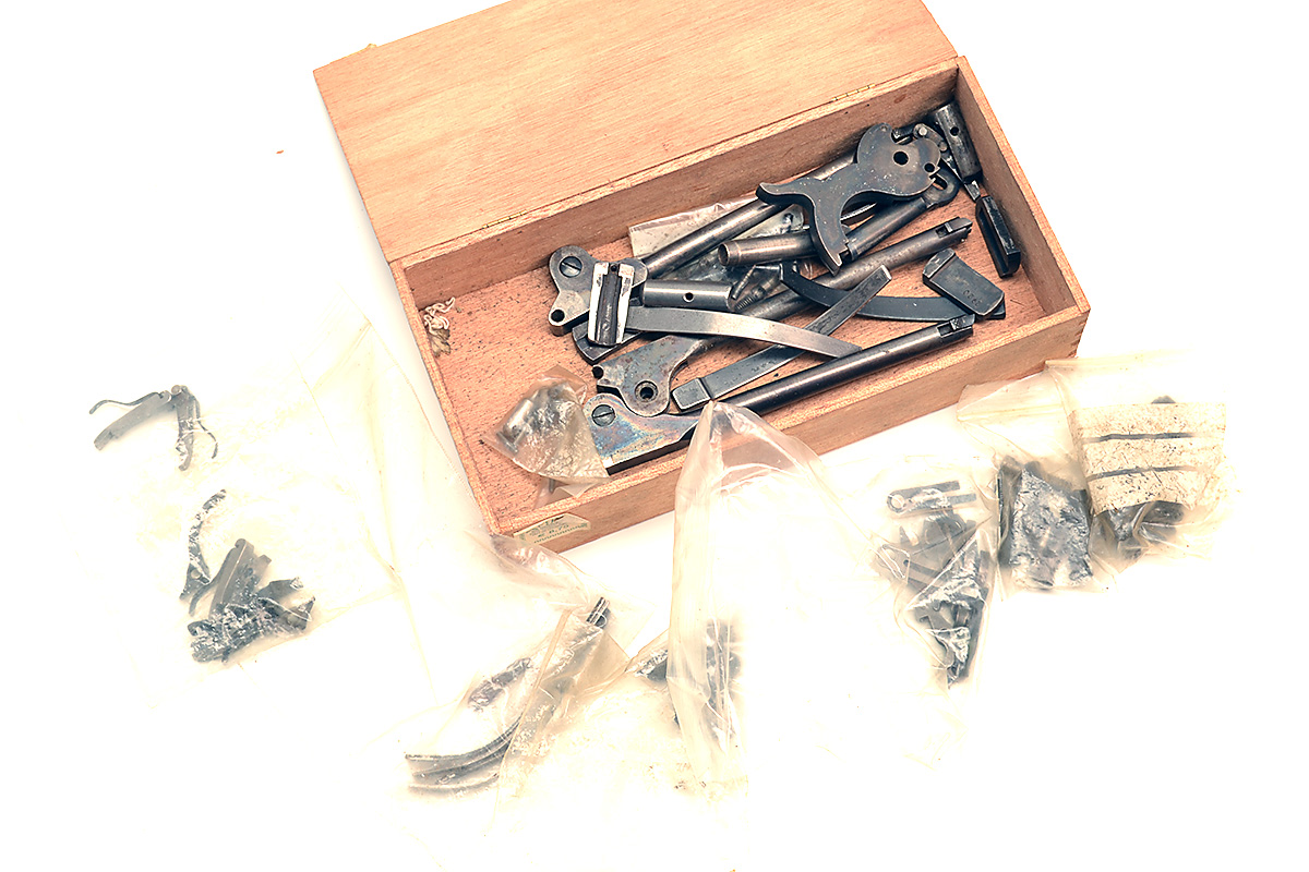 A CIGAR BOX OF SPARE PARTS FOR COLT BLACK-POWDER REVOLVERS, some possibly reproduction and including main-springs, hands, rammers, screws and hammers (qty)