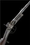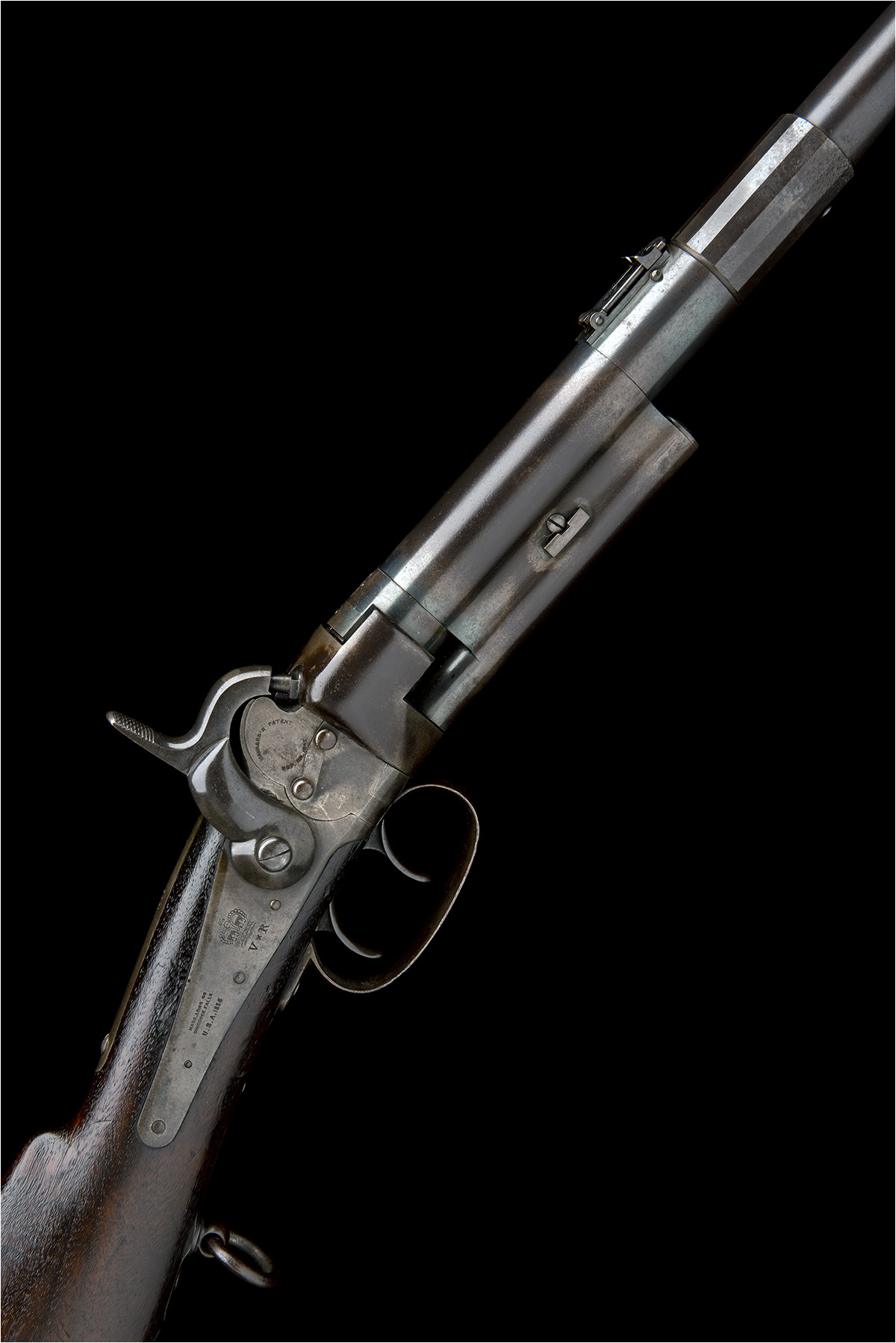 dated for 1856, with tapering round 18in. barrel, dove-tailed block and blade fore-sight, elevating ladder rear-sight, central section of outer barrel faceted for grip, plain receiver, long plain top-tang marked 'GREENE'S PATENT JUNE 27 1854', back-action lockplate fitted with 'Maynard's' tape priming system and marked 'MASS. ARMS CO. CHICOPEE FALLS USA 1856' a 'VR' crown cypher and 'MAYNARD'S PATENT SEPT 22 1845', plain hammer, walnut butt-stock with iron patch-box and semi-crescent heel-plate, saddle-ring to the trigger-guard tang, large trigger-guard bow with two triggers, the front one unlocking the barrel for loading, ordnance stamps and no provision for fore-end