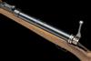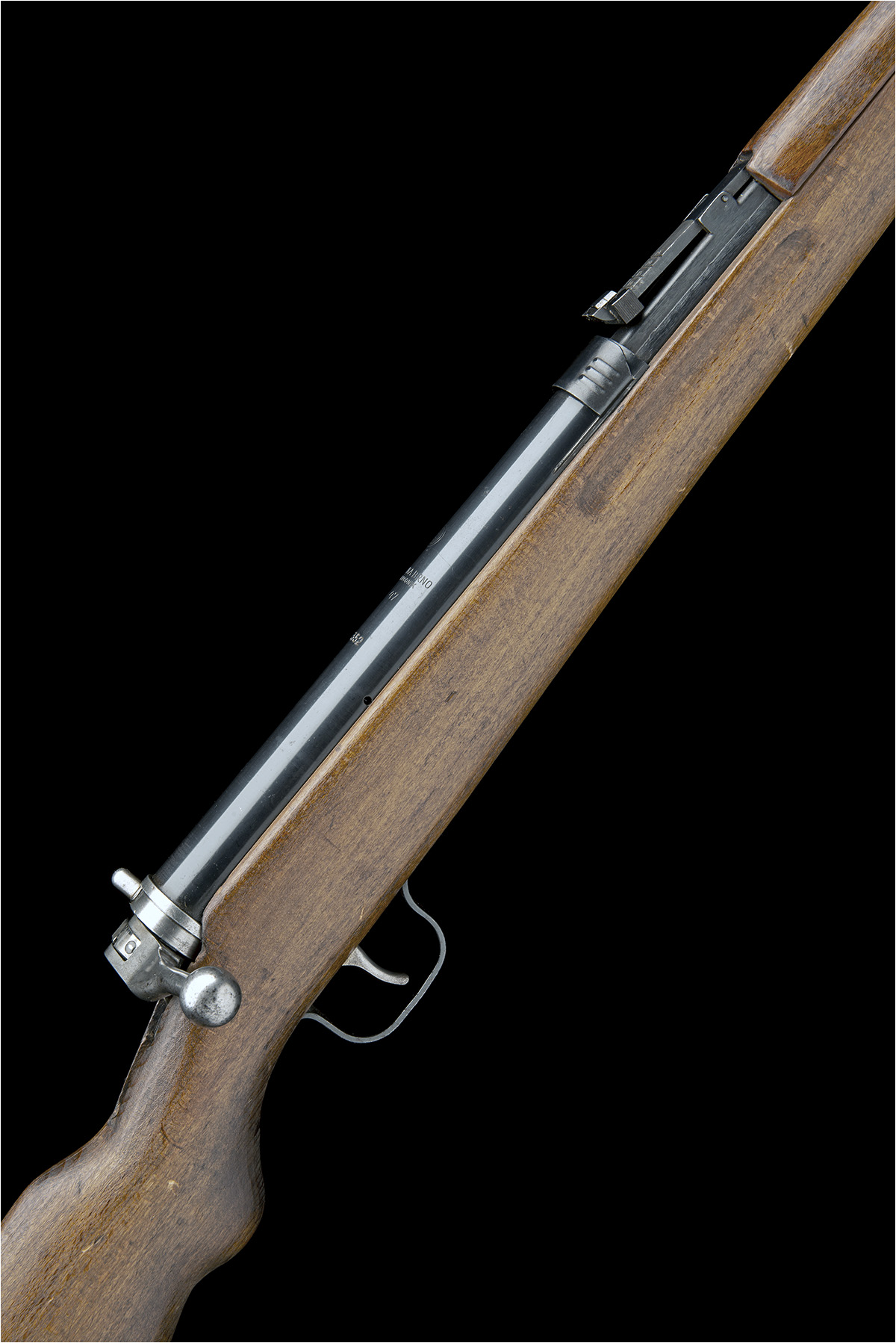 circa 1948 and in loose imitation of a Mauser K98K, with 20in. blued barrel, hooded fore-sight, elevating rear-sight graduated to 25 meters, plain blued air-chamber marked with the 'CZ' trademark, 'ZBROJOVKA BRNO' and 'VZ47', large bolt action cocking handle to rear of air-chamber, wood military style three-quarter stock, fittings for sling and false clearing rod under the barrel, the whole with much original finish