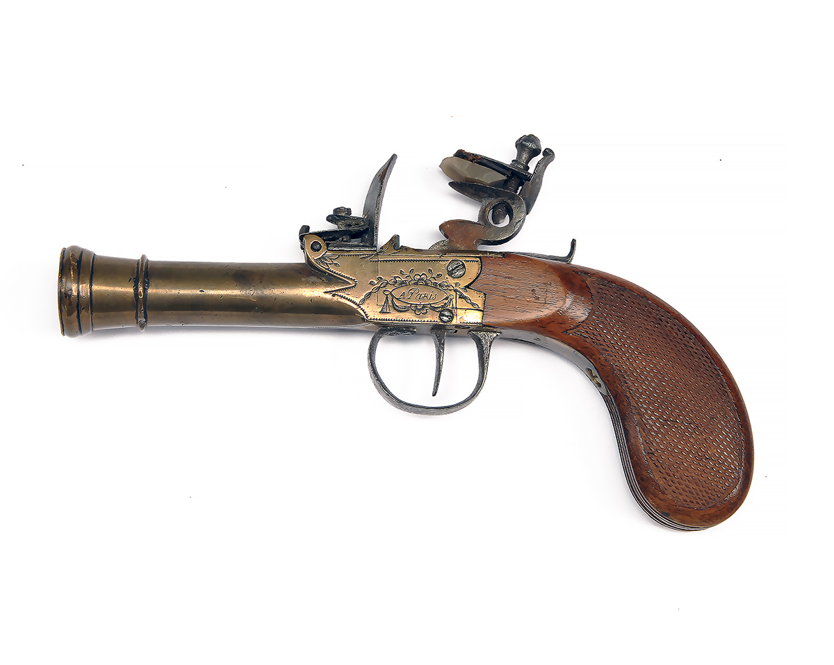 A 54-BORE FLINTLOCK BRASS BLUNDERBUSS PISTOL SIGNED FLORON A PARIS, no visible serial number,
