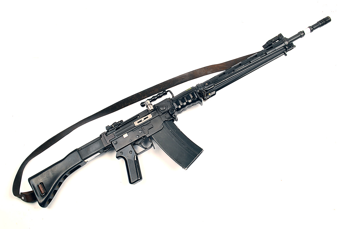 circa 1970, with 26 1/2in. barrel including flash-hider, folding tunnel-fore-sight, folding adjustable diopter rear-sight, iron ventilated hand-guard, pressed-metal receiver and frame, three-position selector (currently semi automatic only), black rubber-coated butt-stock, black plastic pistol-grip, detachable box magazine, black plastic fore-grip and integral folding bi-pod, fitted with a Swiss military leather sling