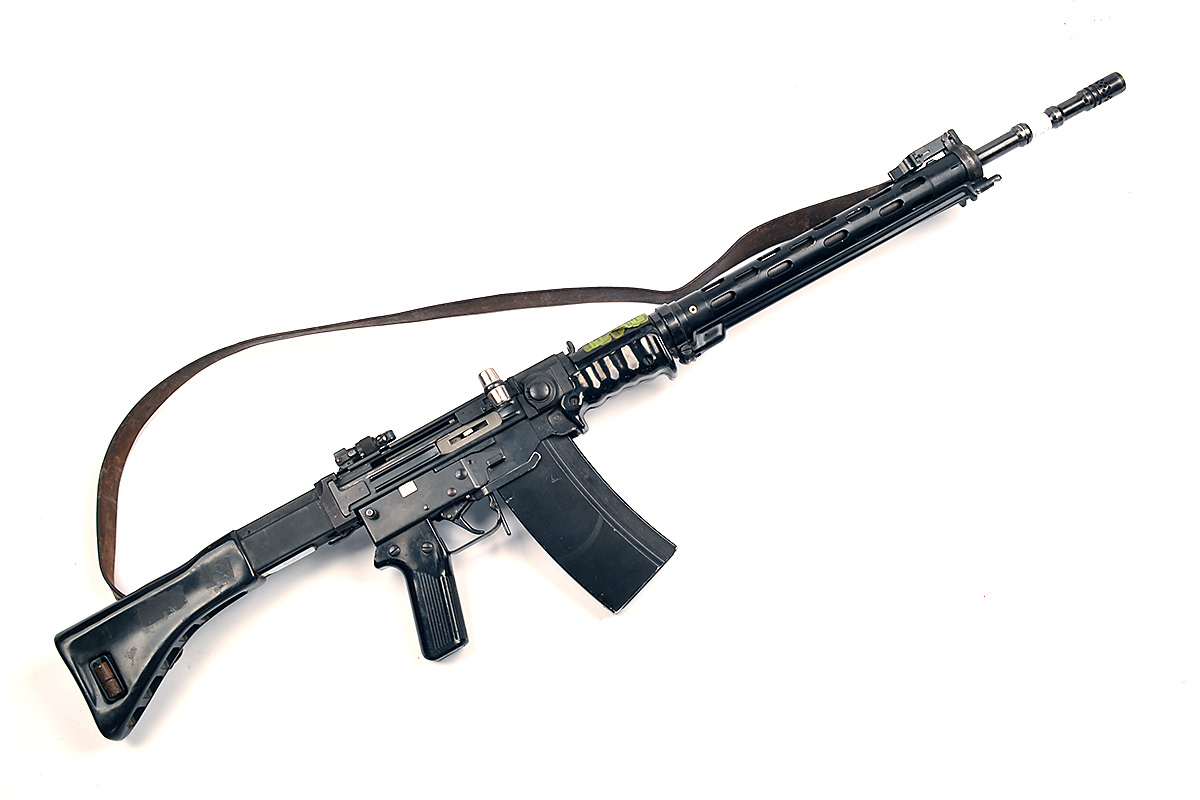 circa 1970, with 26 1/2in. barrel including flash-hider, folding tunnel-fore-sight, folding adjustable diopter rear-sight, iron ventilated hand-guard, pressed-metal receiver and frame, three-position selector (currently semi automatic only), black rubber-coated butt-stock, black plastic pistol-grip, detachable box magazine, black plastic fore-grip and integral folding bi-pod, fitted with a Swiss military leather sling