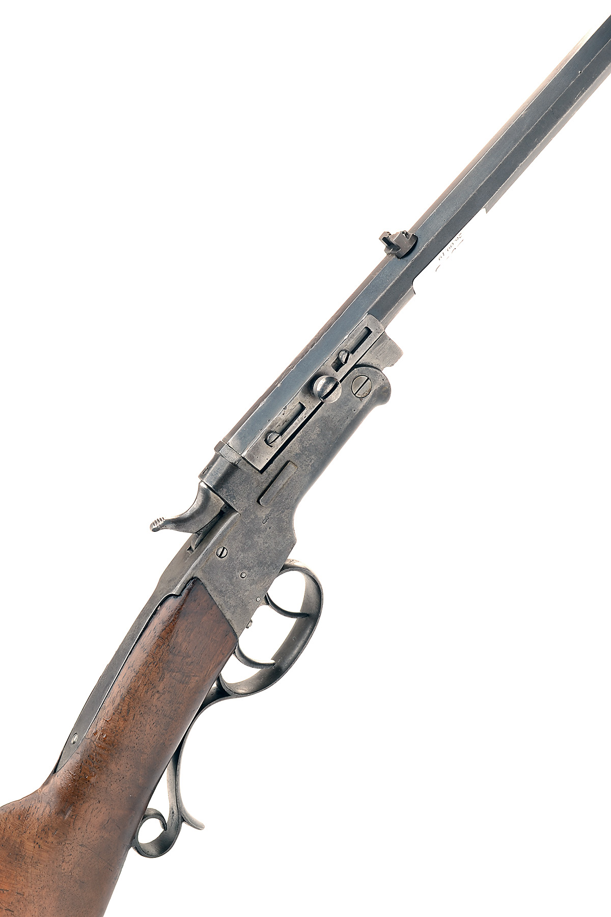 German circa 1880, with octagonal sighted 24in. barrel, open iron frame with push-button opening, central hammer, walnut butt-stock and no provision for fore-end