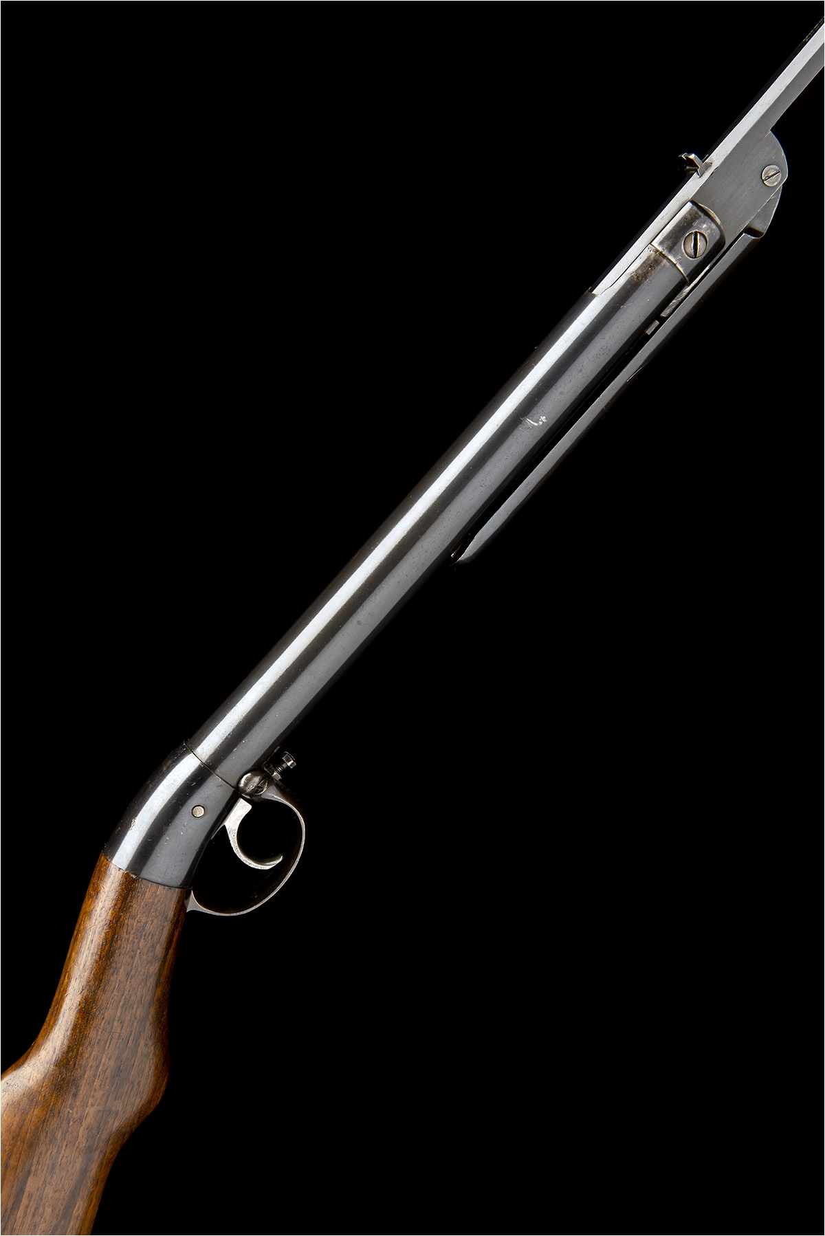 possibly a model 26 'Youth', with blued octagonal to round 18 3/4in. barrel, the top-flat near breech stamped 'DIANA-LUFT-GEWEHR', the left hand side of breech-block with MGR circle trade-mark, shallow dove-tailed blade fore-sight, standing notch rear-sight, blued plain air-chamber and trigger-unit, walnut semi pistol-grip butt-stock with iron heel-plate and cocking link in lieu of fore-end, much apparently original finish remaining