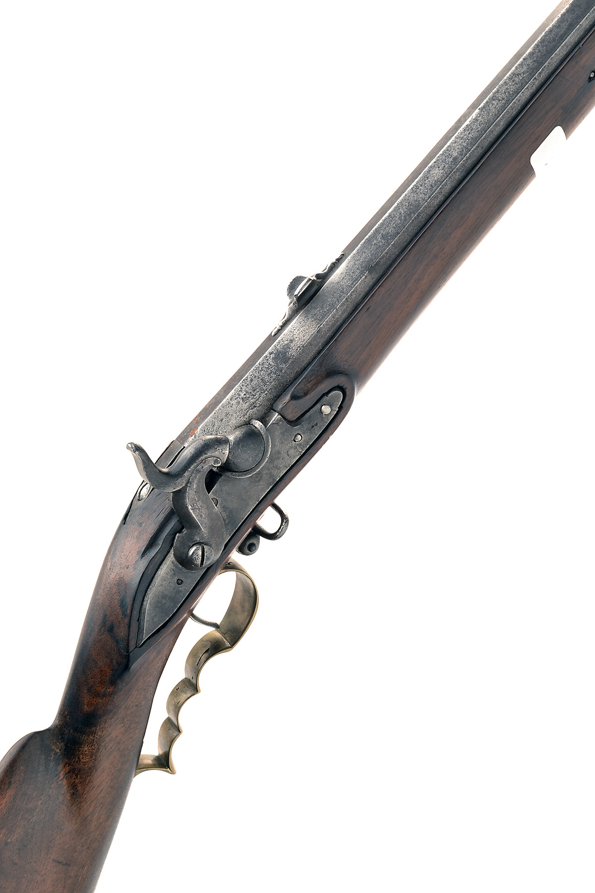Continental and converted from flintlock, with 30 1/2in. two-stage barrel, plain lock and walnut half-stock cut back from full, with a replacement ramrod