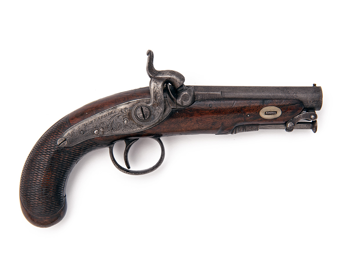 circa 1835, with octagonal to round 3 3/4in. barrel marked with the number (faint), bead fore-sight and standing notch rear-sight, engraved top-tang, borderline and scroll engraved back-action lock signed 'J. BRADDELL', walnut full-stock with chequered bag-shaped butt, guarded trigger and captive iron ramrod